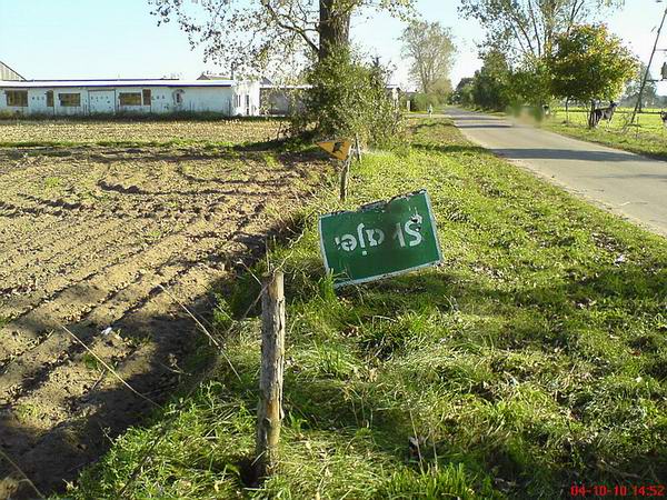 Przed piękną wsią prawdopodobnie SKAJE leżą ścięte dwa znaki drogowe. Przechodzeń bardziej bystry niż ja, zaprzeczył mojej interpretacji, a nieco podenerwowany oznajmił: „ Nie widzi Pan, krowa leży, a wieś Staje!!”. Jednak ja, dalej nie wiem. Czy miał rację? Podpis: Pieszy