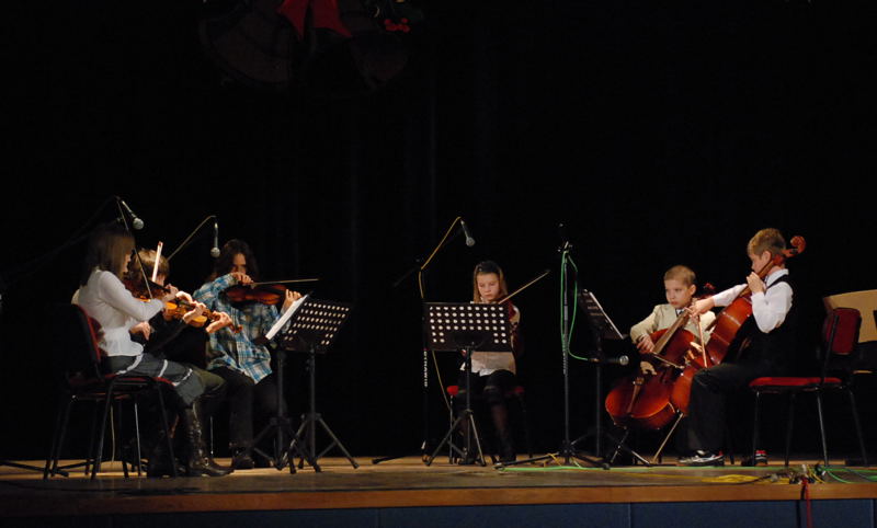 Koncert mikołajkowy dla dzieci przedszkolnych, który odbył się w sali kinowej MDK 14-12-2010. Gra Zespół Smyczkowy ze Szkoły Muzycznej 1 st. w Grajewie. (opiekun pan P. Przydworski) Podpis: HRP