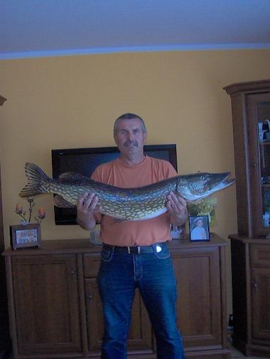 Szczupak waga 10 kg, długość 100 cm, złowiony na wędkę na jeziorze Rajgrodzkim. Podpis: Mirek
