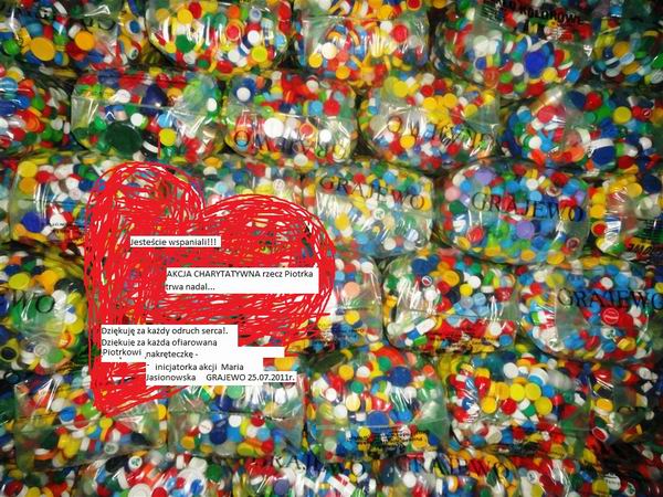 Pragnę poinformować, że do chwili obecnej zebraliśmy ponad 2 tony nakretek. Akcja oczywiście trwa nadal. Pozdrawiam serdecznie Maria Jasionowska