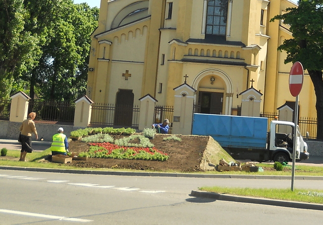 czerwony wilk zaczyna wyłaniać się w herbie układanym z kwiatów w centrum Grajewa;