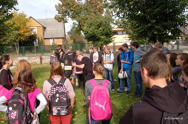 IX 2012 r. - gimnazjaliści PG nr 2 podczas szkolenia prowadzonego przez strażaków Ochotniczej Straży Pożarnej; w budynku szkoły odbywały dalsze części zajęć edukacyjnych z zakresu ratownictwa;