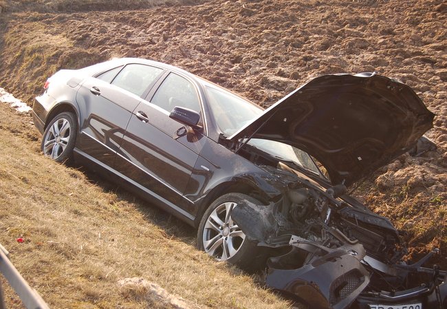 17.04.2013 r., okolice m. Miecze (DK 61) - kierowca mercedesa z Litwy prawdopodobnie zasnął za kierownicą;