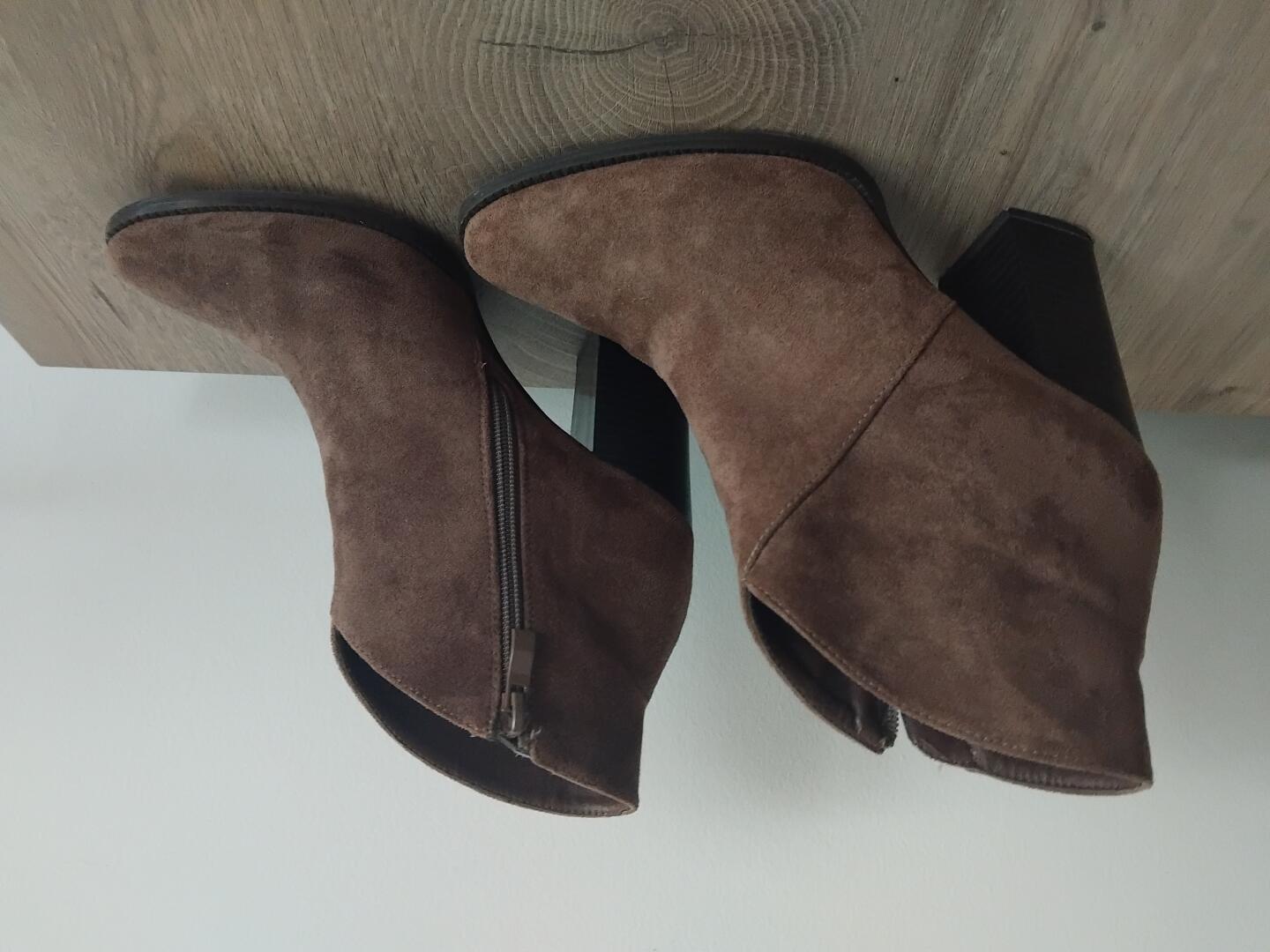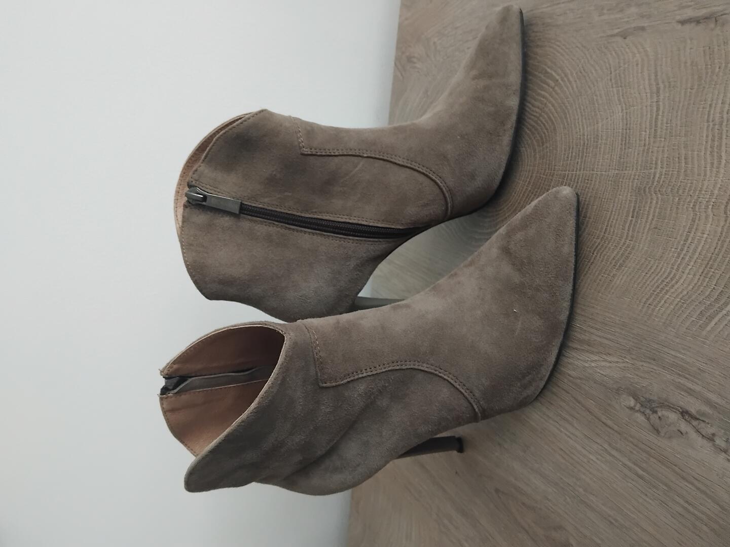 Sprzedam botki damskie - dwie pary, stan bardzo dobry, bez uszkodzeń, mało używane, 100% naturalna skóra zamszowa. Rozmiar obu par to 38. Jedna z par w kolorze beżowym, szpilka 8-9 cm. Druga para kolor brązowy, obcas szeroki 8 cm. Podana cena za parę.