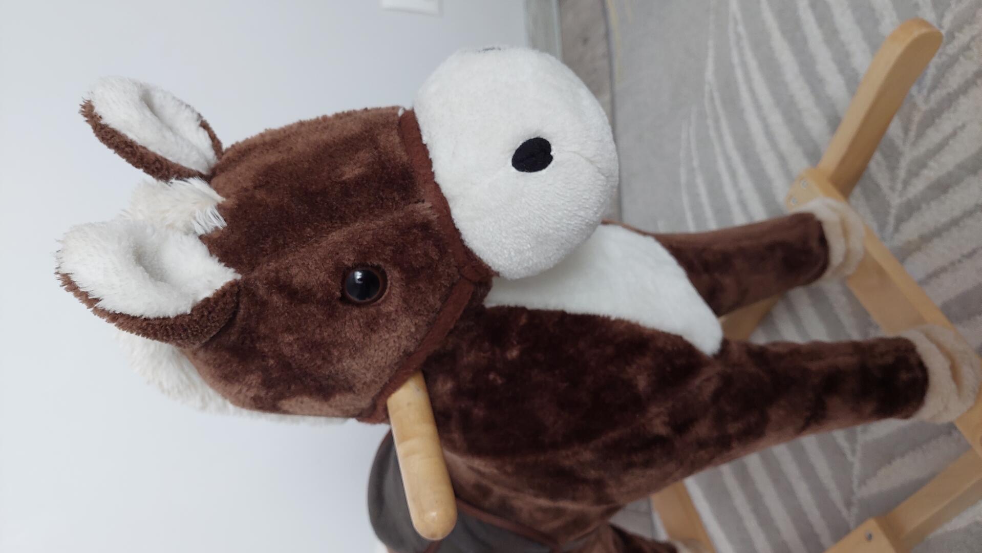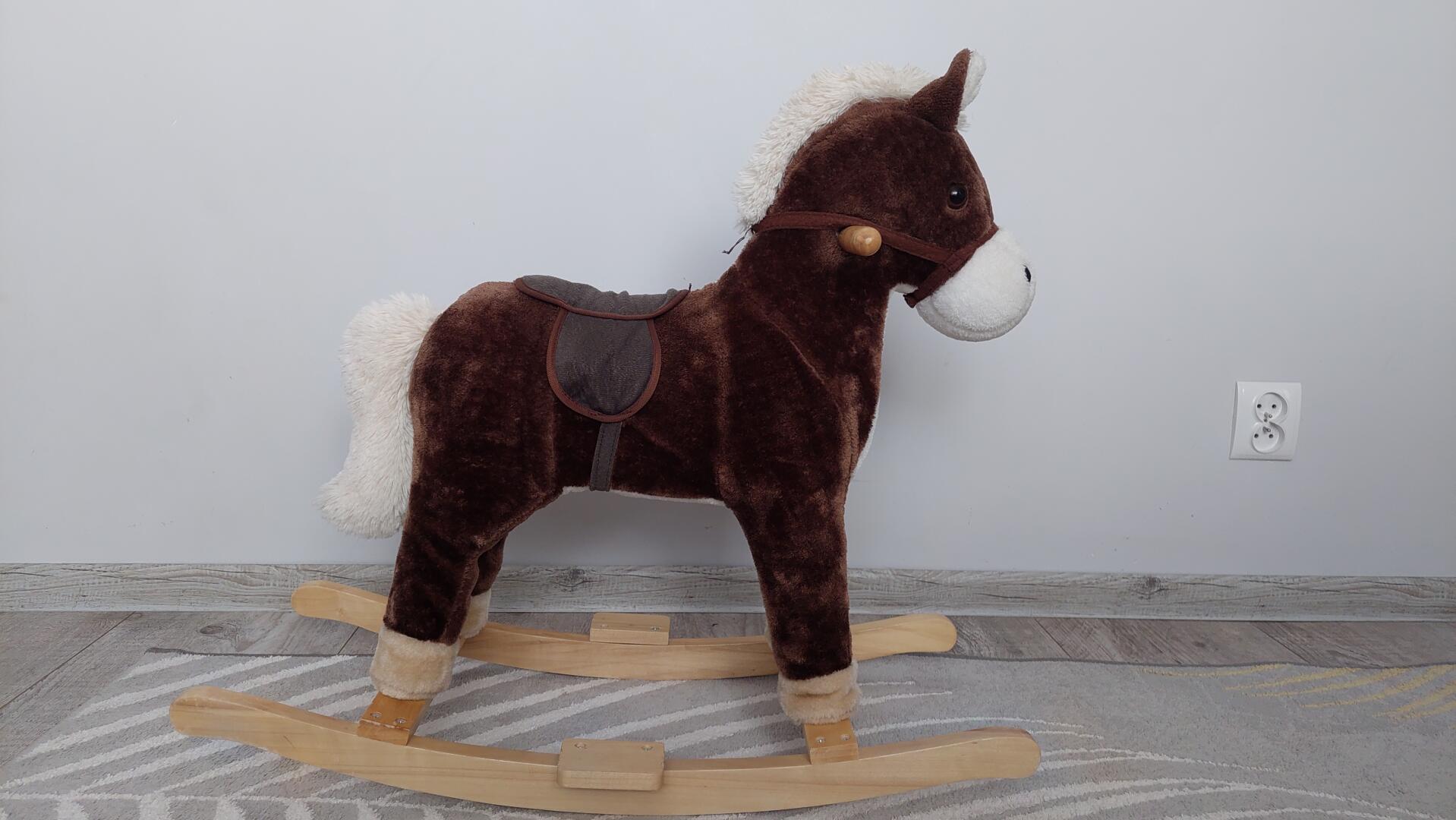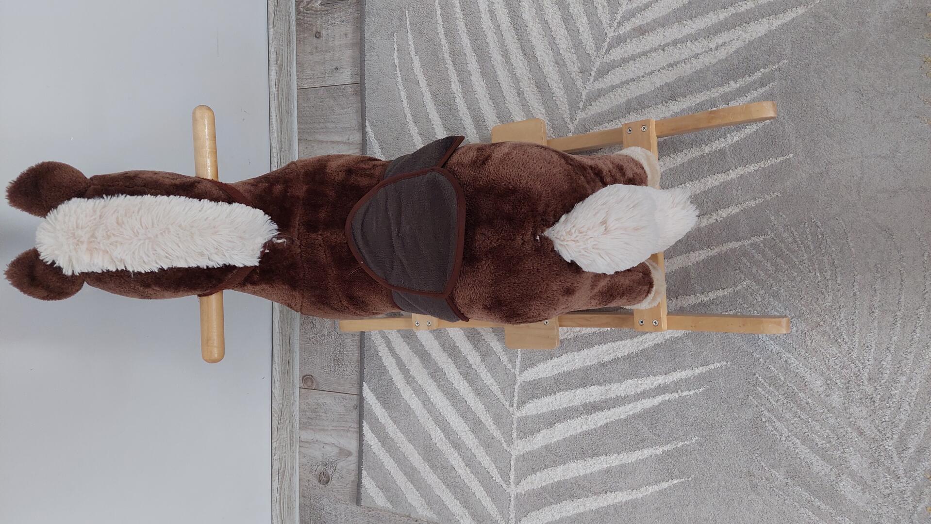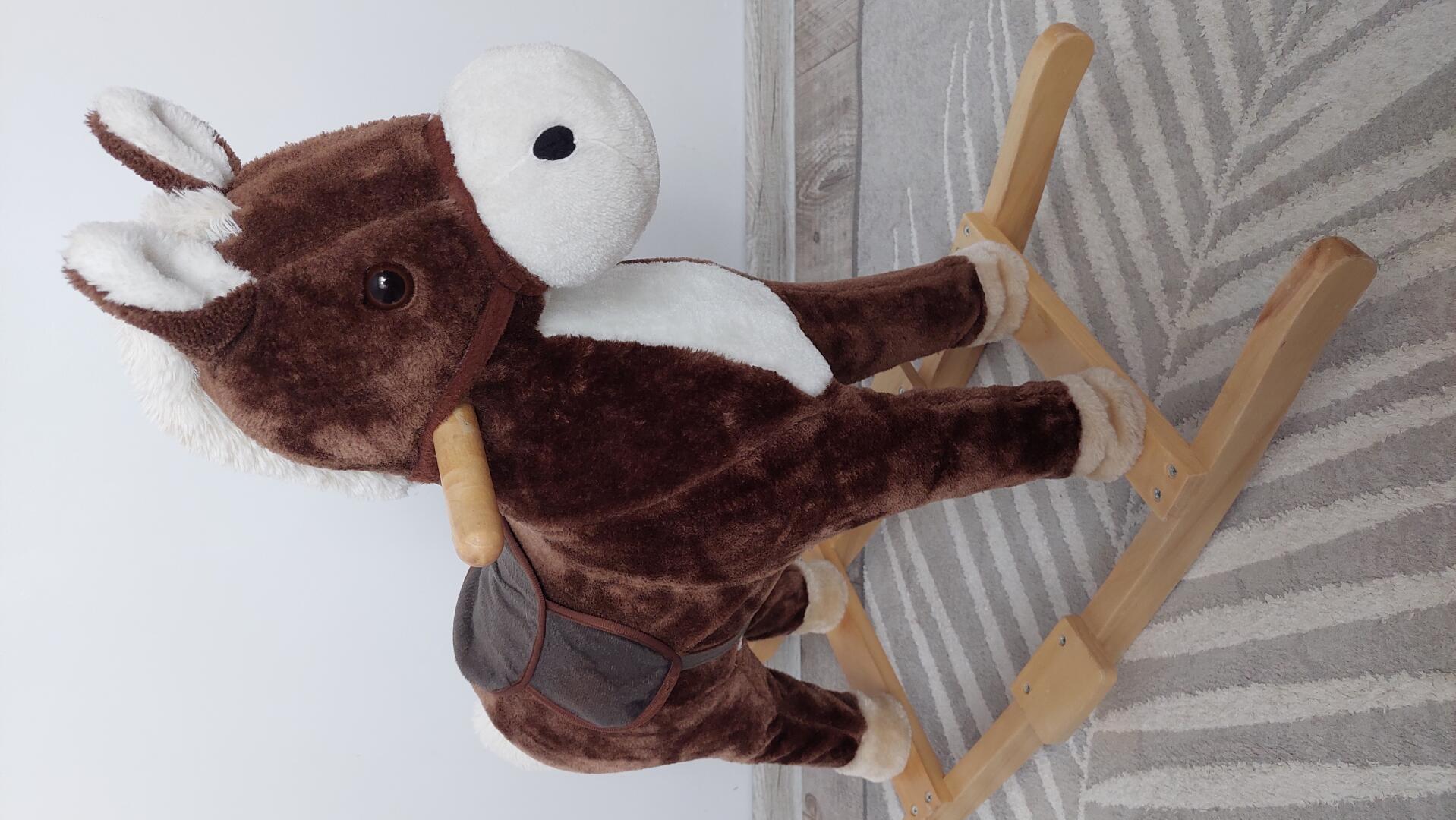 Koń na biegunach w stanie bardzo dobrym. Idealnie nada się dla mniejszych dzieci. Wymiary: długość całkowita- 70cm, wysokość całkowita- 62cm, wysokość do siedziska- 45cm, szerokość całkowita (płozy)- 35cm.