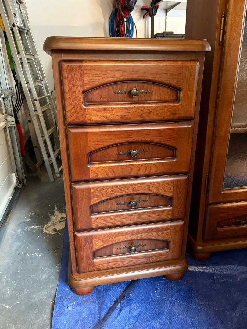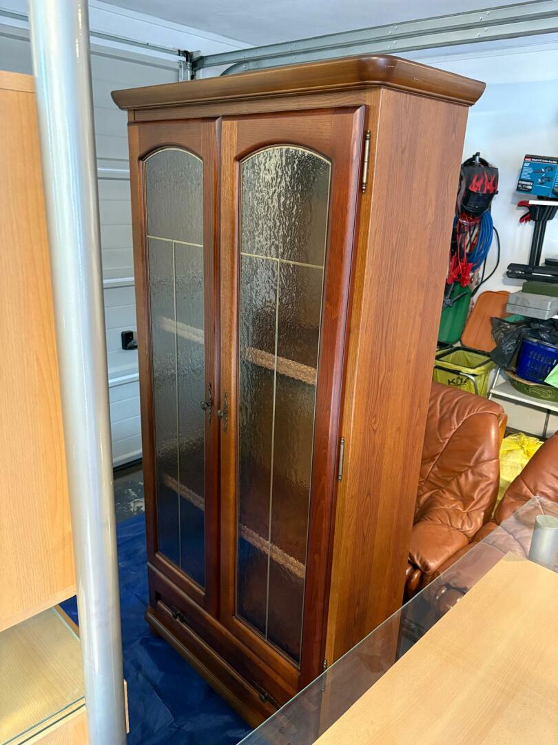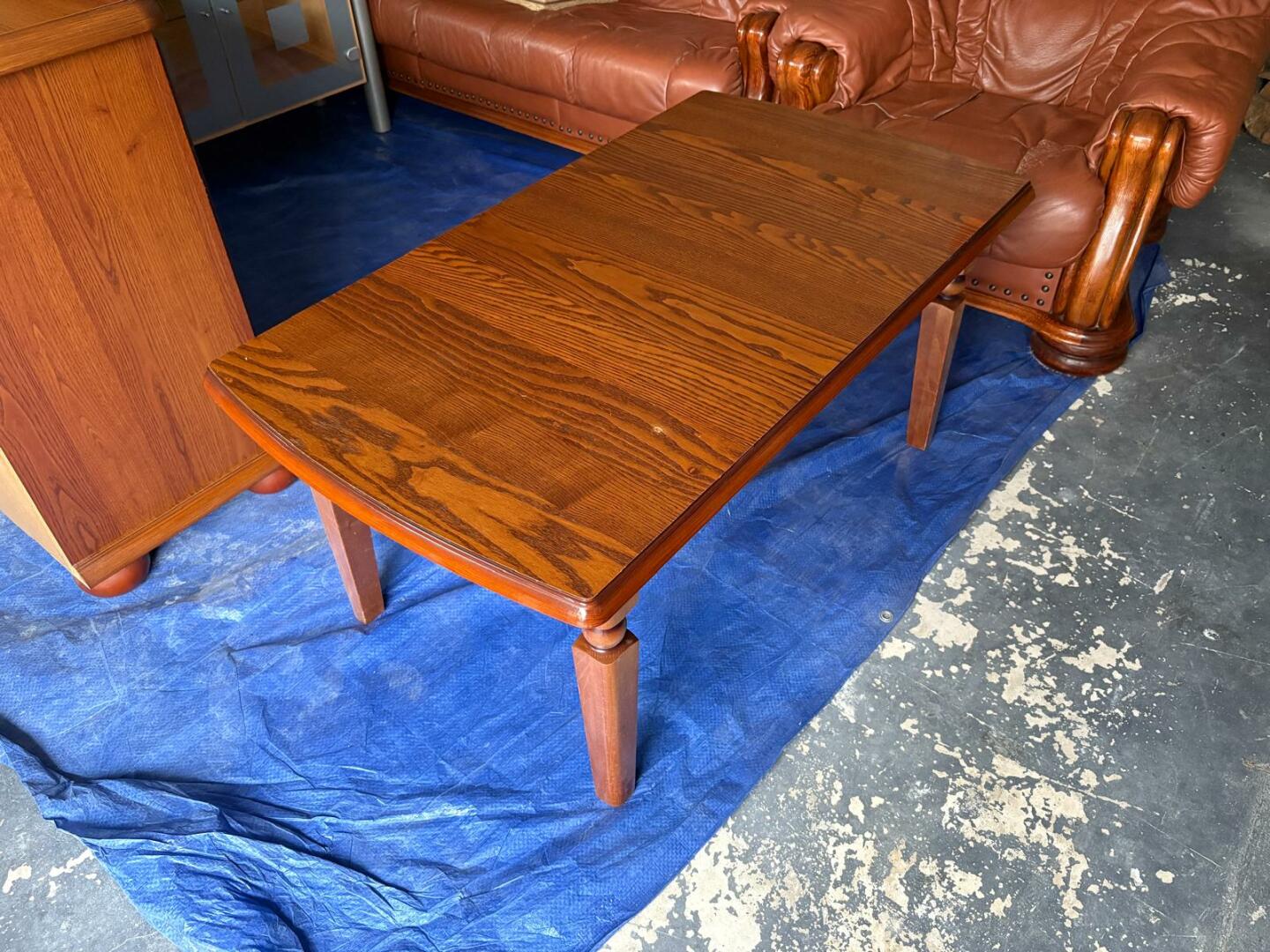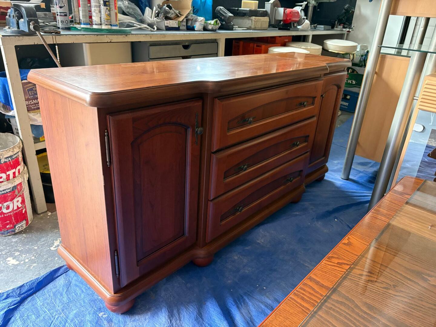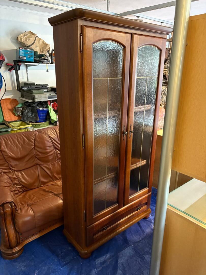 Komplet mebli drewnianych. Witryna, komoda, szafka, ława