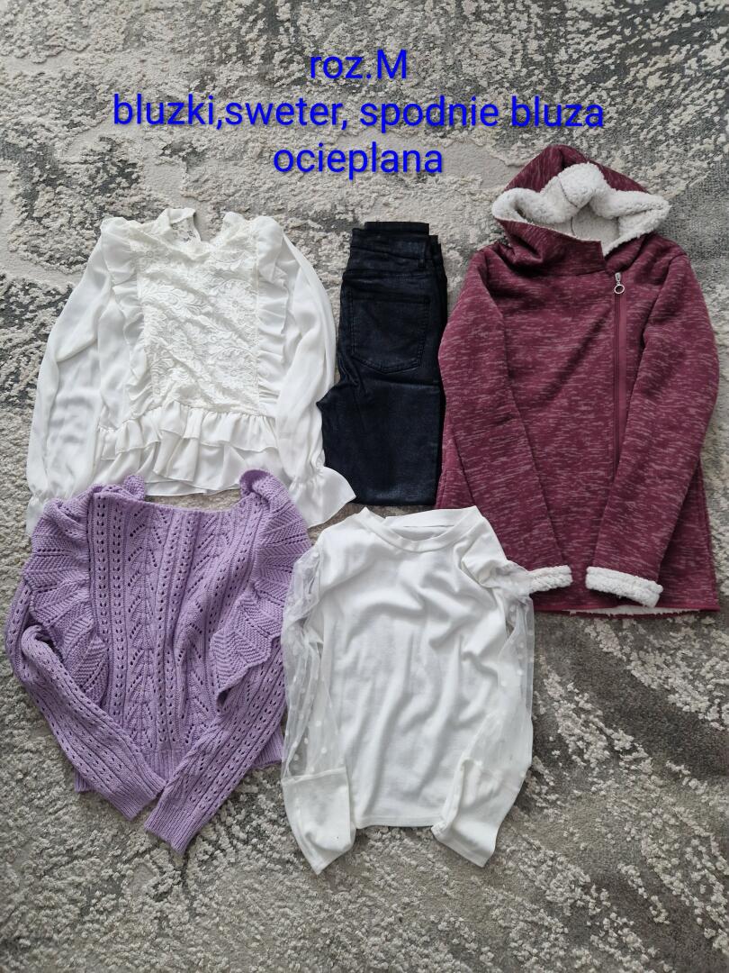 Sprzedam ubrania roz.M Bluzki,sweter,spodnie nowe,bluza ocieplana.Stan bardzo dobry.
