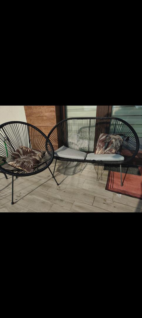 Sofa i fotel tarasowe. Sofa ma pęknięte dwie linki, do naprawienia. Szare poduchy w zestawie.