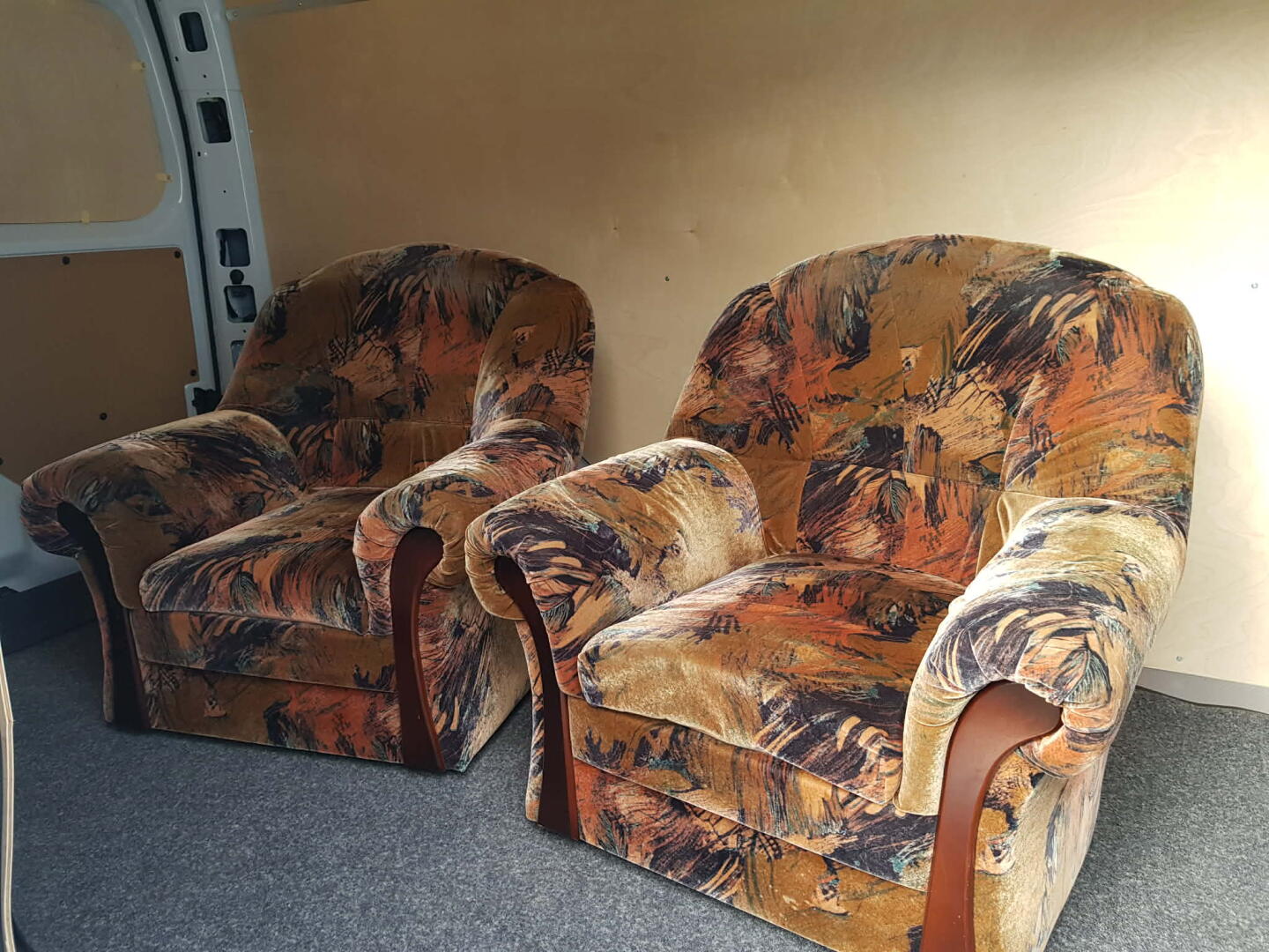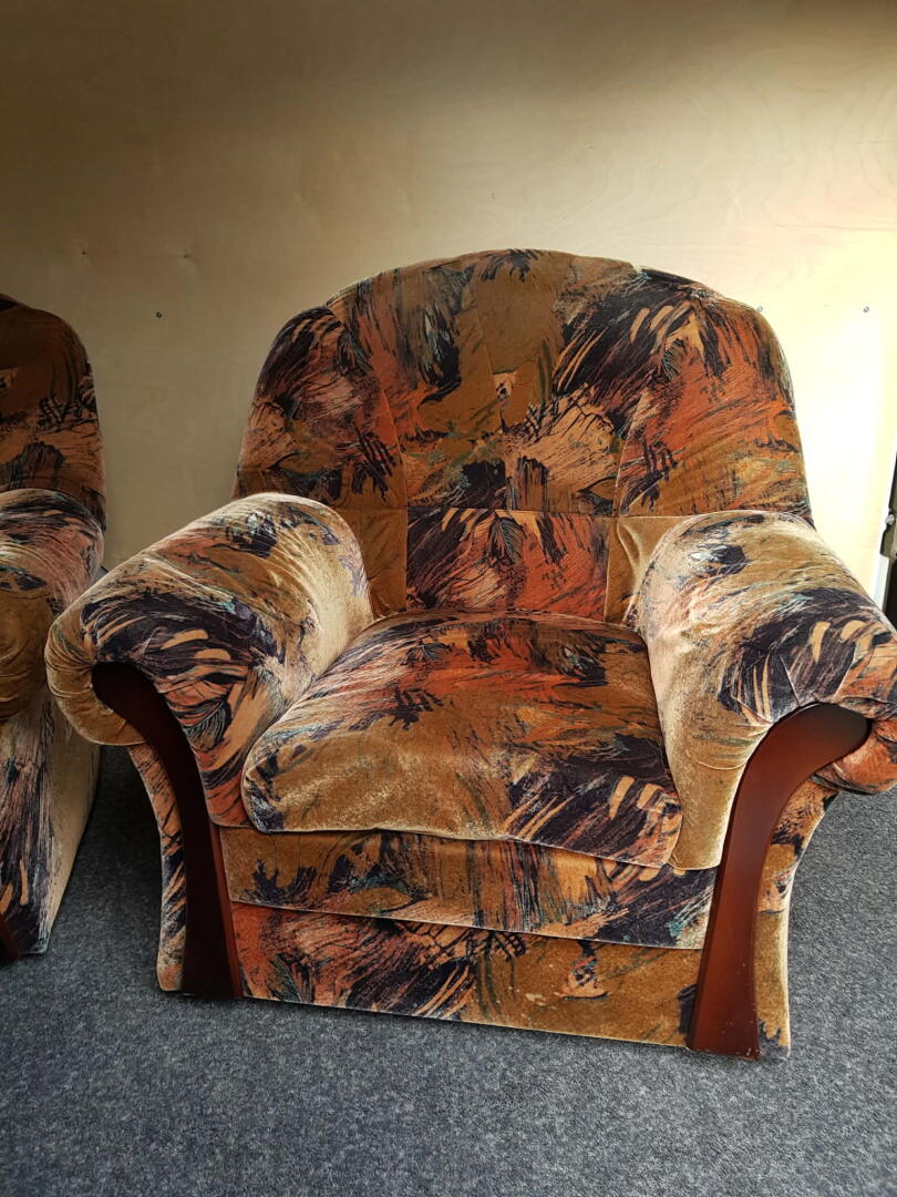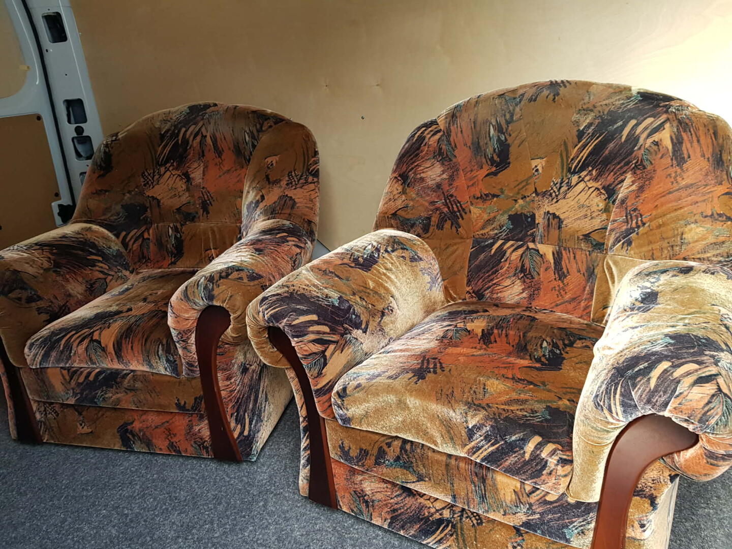 Zestaw dwóch wygodnych foteli w ciekawym wzorze. Mebel jest używany, ale w dobrym stanie. Nadaje się do wykorzystania w salonie lub innym pomieszczeniu. Fotele zapewniają komfort siedzenia bardzo wygodne.