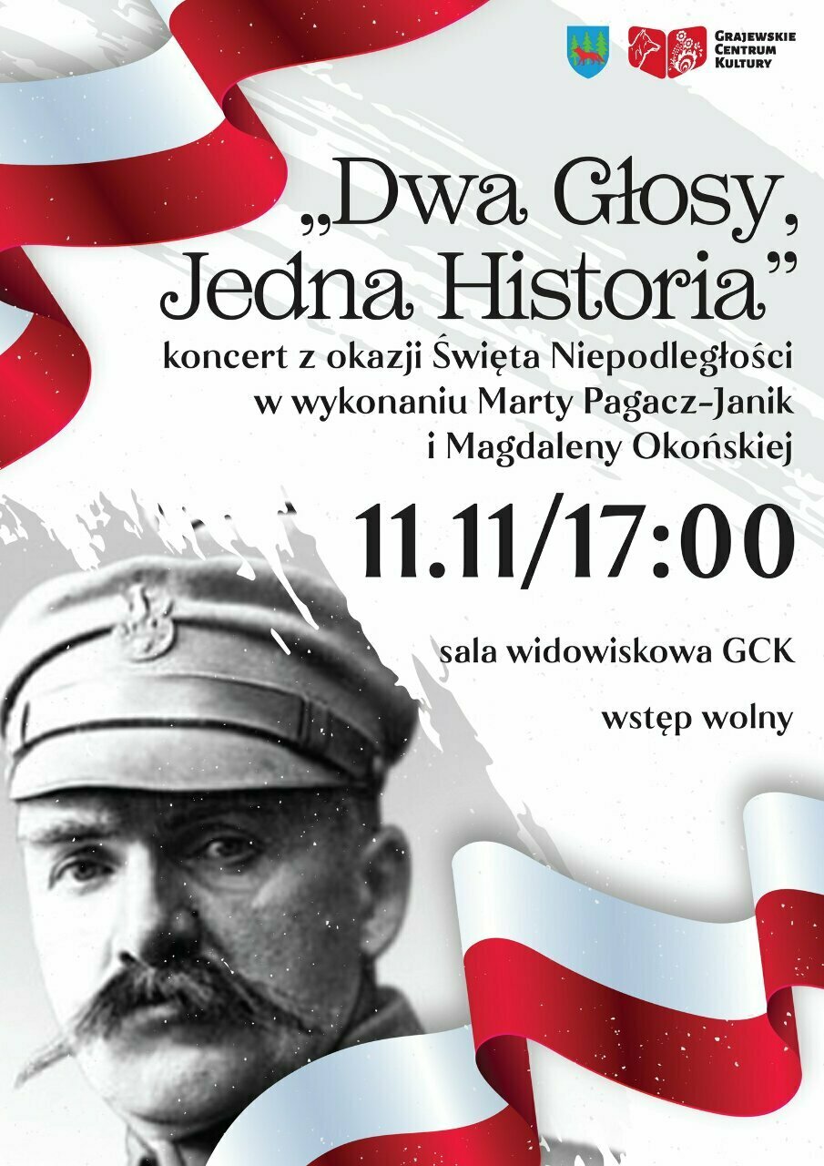 11 XI godz. 17.00 - Koncert okolicznościowy w sali widowiskowej Grajewskiego Centrum Kultury (ul. Wojska Polskiego 20) pt. "Dwa głosy, jedna historia" - w wykonaniu solistek operowych: Marty Pagacz-Janik i Magdaleny Okońskiej (wstęp wolny).
