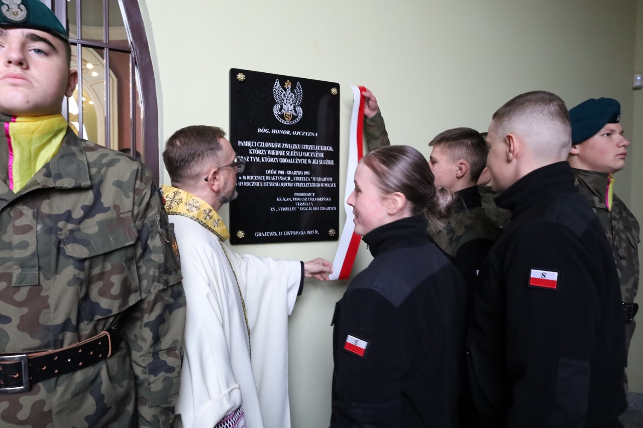 Obchody rozpoczęła uroczysta msza święta w kościele pw. Św. Jana Pawła II w Grajewie, koncelebrowana przez proboszcza ks. Tomasza Chludzińskiego. W jej trakcie odsłonięto i poświęcono tablicę memoratywną upamiętniającą członków Związku Strzeleckiego – zarówno tych, którzy z oddaniem służyli Ojczyźnie, jak i tych, którzy ponieśli najwyższą ofiarę w jej obronie. W imieniu władz samorządowych Powiatu Grajewskiego kwiaty i znicze pod tablicą złożyli Starosta Grajewski Waldemar Remfeld, Wicestarosta Grajewski Maria Gwiazdowska oraz Przewodniczący Rady Powiatu Grajewskiego Grzegorz Gardocki. Hołd oddał także Komendant grajewskiego Związku Strzeleckiego Michał Łopatowski.