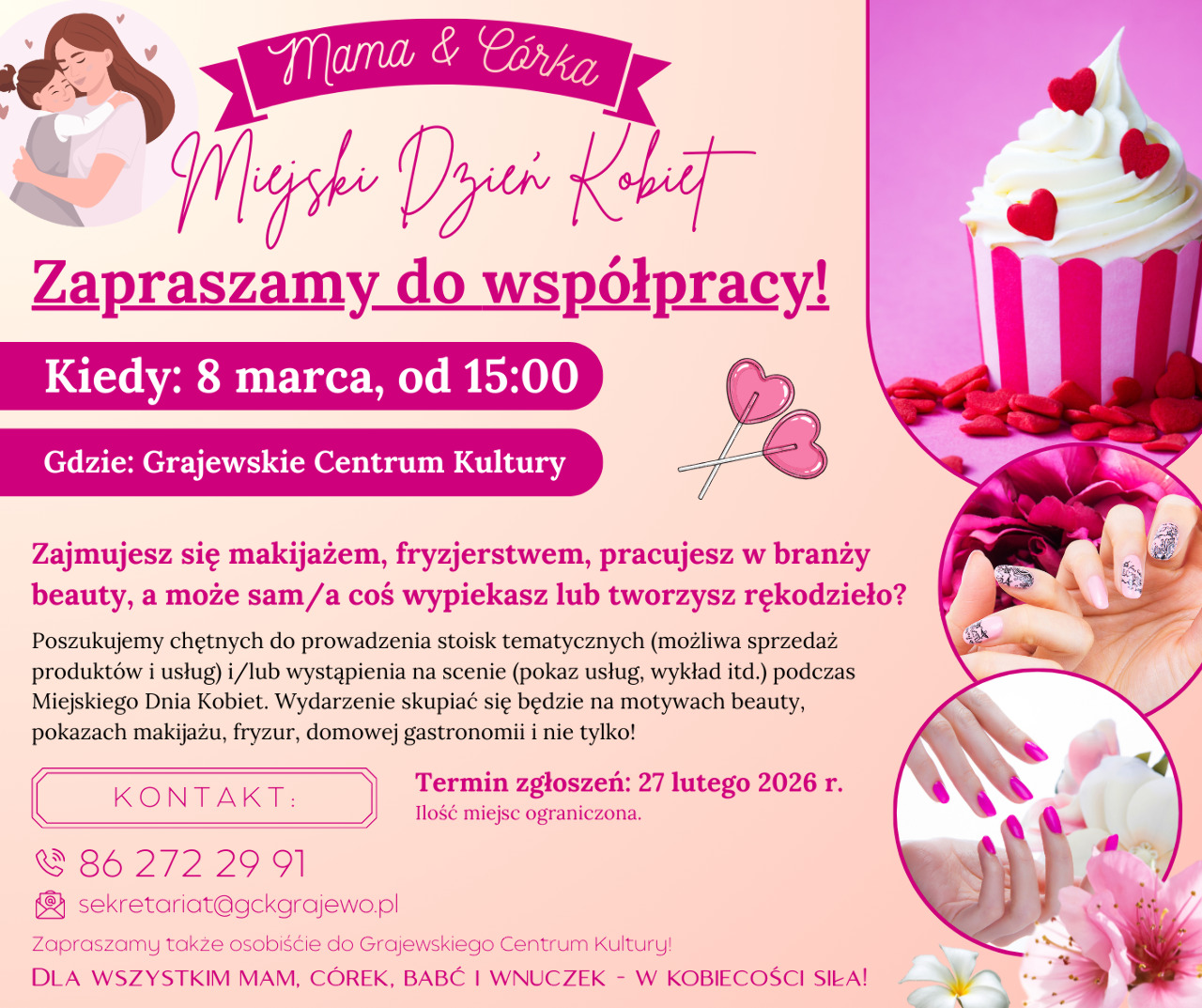 8 marca w Grajewskim Centrum Kultury organizujemy Miejski Dzień Kobiet pod hasłem „Świętuj Dzień Kobiet razem z córką” – i właśnie teraz kompletujemy strefę stoisk oraz scenę.