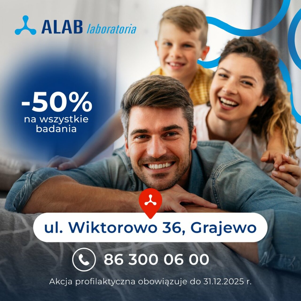 W Punkcie Pobrań ALAB Laboratoria w Grajewie dostępne są również różnorodne akcje profilaktyczne, umożliwiające wykonanie szerokiego zakresu badań, co pozwala na kompleksową ocenę stanu zdrowia. Pełny zakres godzin pracy Punktu Pobrań dostępny jest na stronie www.alab.pl.