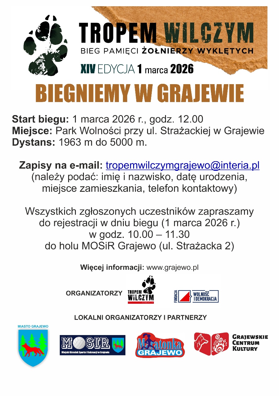 Trwają zapisy na „Tropem Wilczym. Bieg Pamięci Żołnierzy Wyklętych” w Grajewie. Bieg odbędzie się 1 marca 2026 r. (niedziela) o godzinie 12.00 w Parku Wolności przy ul. Strażackiej.