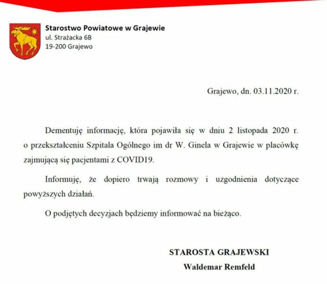 - Dementuję informację, która pojawiła się w dniu 2 listopada 2020 r. o przekształceniu Szpitala Ogólnego im dr. W. Ginela w Grajewie w placówkę zajmująca się pacjentami z Covid-19. Informuje, że dopiero trwają rozmowy i uzgodnienia dotyczące powyższych działań. O podjętych decyzjach będziemy informować na bieżąco - zakomunikował 3 listopada Starosta Grajewski Waldemar Remfeld