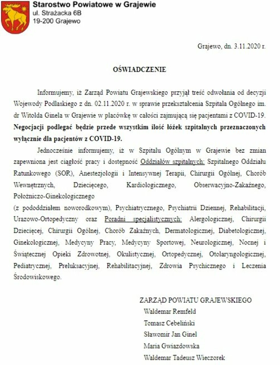 * Poniżej Oświadczenie Zarządu Powiatu Grajewskiego z dn. 3.11.2020 r.