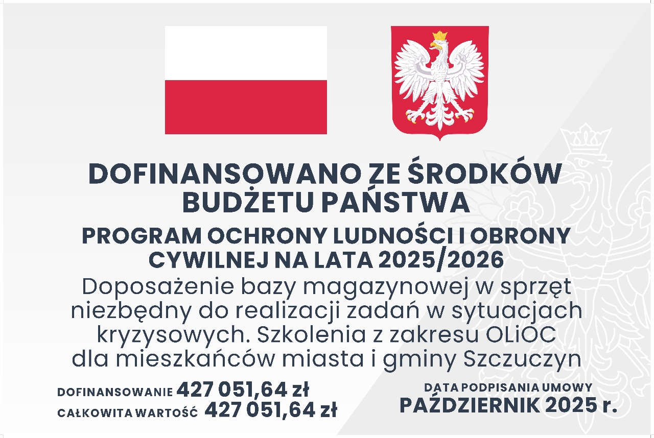 W ramach zawartej w październiku 2025r. umowy o dofinansowanie w formie dotacji celowej na realizację zadań własnych Jednostek Samorządu Terytorialnego w obszarze „Ochrony Ludności i Obrony Cywilnej”, udzielonej przez Podlaski Urząd Wojewódzki, gmina Szczuczyn rozdysponowała środki w wysokości 427 051,64 zł. Kwota ta pokryła w całości wydatki gminy na cele realizacji założonych zadań z zakresu ochrony ludności i obrony cywilnej w 2025r.
