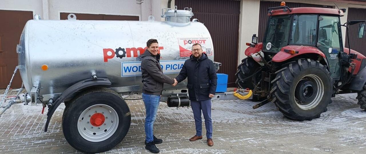 W dniu 17.02.2026 r. Pan Grzegorz Górski - Wójt Gminy Grajewo odebrał od Pana Bogdana Malinowskiego - przedstawiciela firmy "ADROL" Daniel Gosiewski, fabrycznie nową przyczepę do dystrybucji wody pitnej na wypadek zdarzeń kryzysowych o pojemności 5000 litrów.