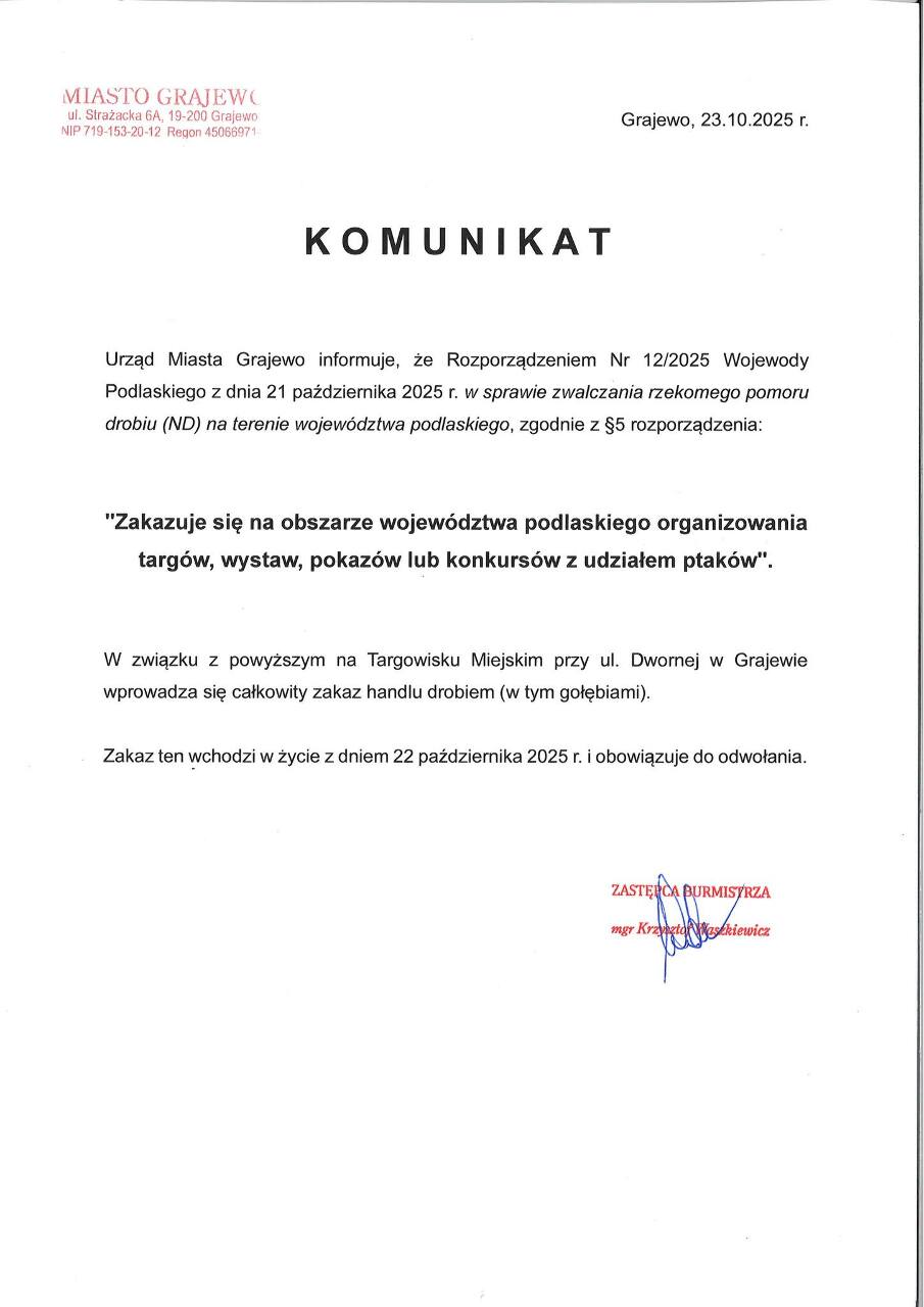 Urząd Miasta Grajewo informuje, że Rozporządzeniem Nr 12/2025 Wojewody Podlaskiego z dnia 21 października 2025 r. w sprawie zwalczania rzekomego pomoru drobiu (ND) na terenie województwa podlaskiego, zgodnie z §5 rozporządzenia: