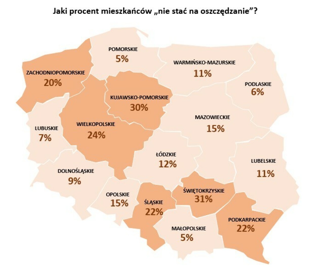 Są też takie regiony, gdzie mieszkańcy przyznają, że „nie stać ich na oszczędzanie” – cały miesięczny budżet przeznaczają na bieżące wydatki. W województwach świętokrzyskim czy kujawsko-pomorskim deklaruje tak niemal co 3. osoba.