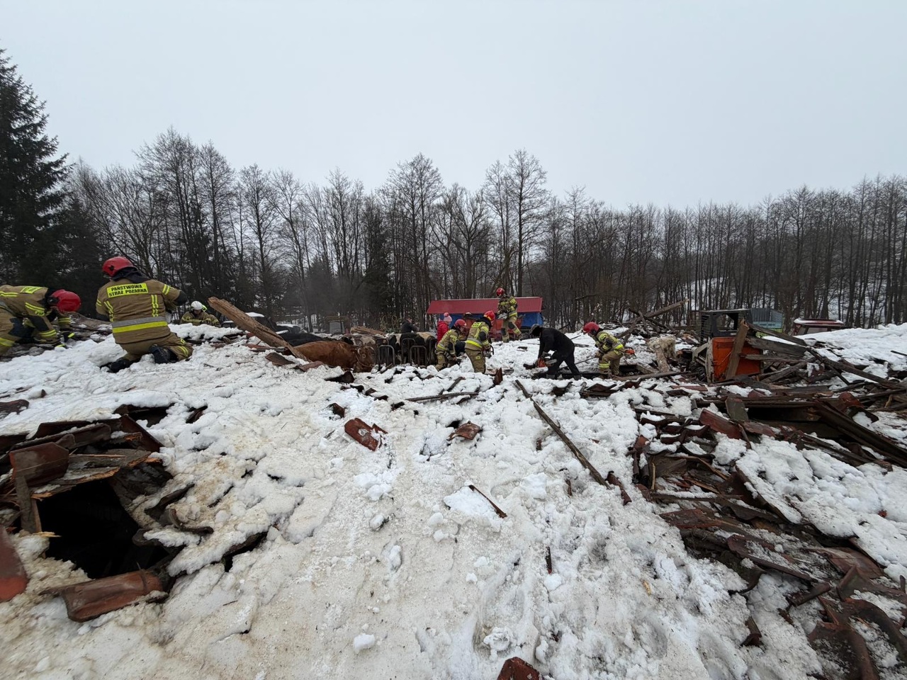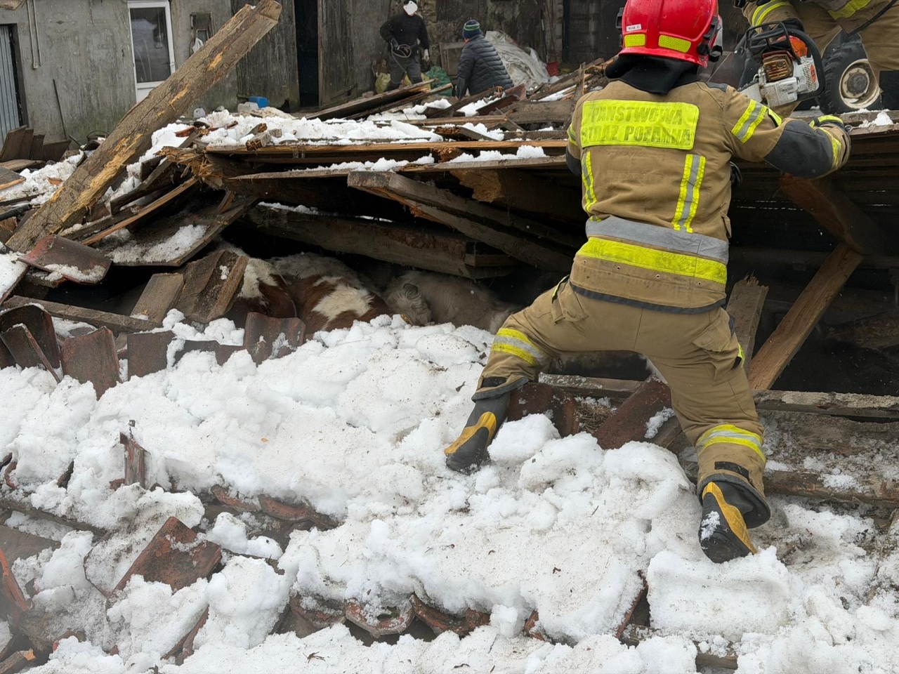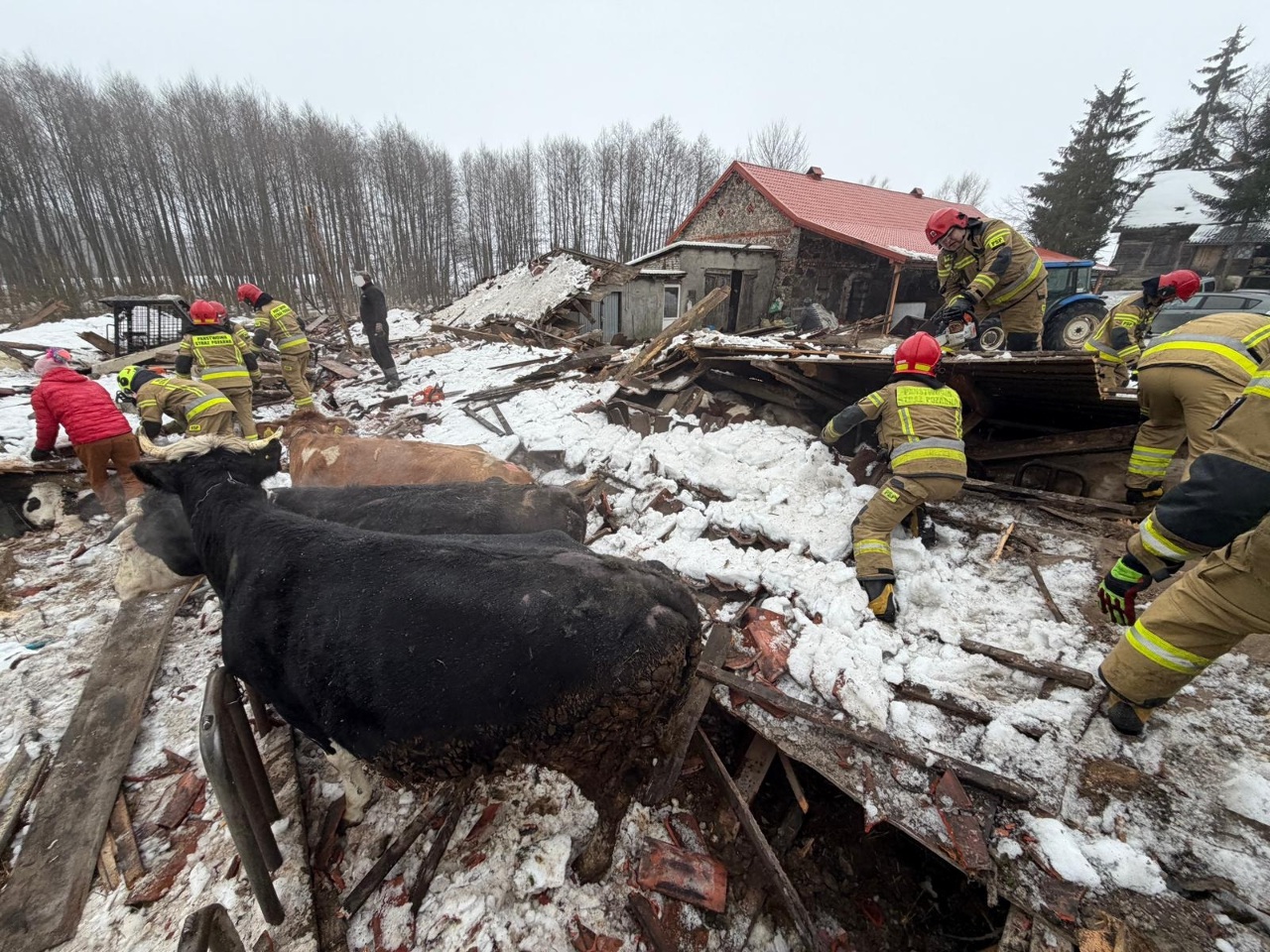 Do działań ratowniczych zadysponowano zastępy pożarnicze z jednostki ratowniczo-gaśniczej w Ełku oraz okoliczne jednostki Ochotniczych Straży Pożarnych. W sumie pracowało sześć zastępów pożarniczych. Akcją ratowniczą dowodził Komendant Powiatowy Państwowej Straży Pożarnej w Ełku. Strażacy wraz z właścicielami obiektu wydobyli spod rumowiska wszystkie zwierzęta, niestety w wyniku zdarzenia cztery sztuki padły. - mł. bryg. Grzegorz Różański