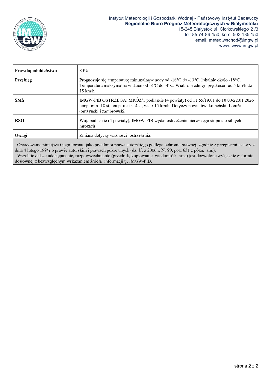 Prognozuje się temperaturę minimalną w nocy od -18°C do -15°C, lokalnie około -24°C.