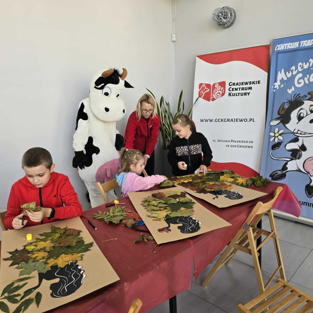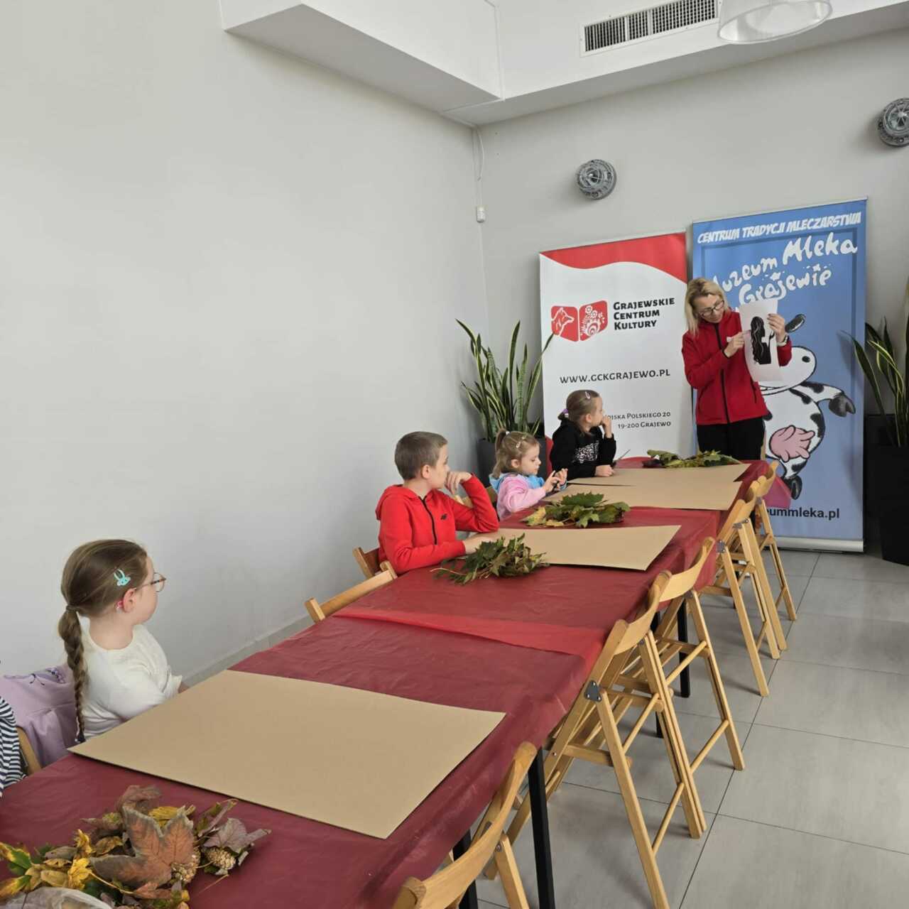 Dziś odbyło się ostatnie w tym roku spotkanie z cyklu „ Kultura i Natura. Zielone przedpołudnia z Krówką Matyldą”. Nasze spotkanie dotyczyło poznania pięknej jesieni poprzez zabawę i warsztaty. Ze względu na niekorzystną temperaturę powietrza ustaliliśmy na miejscu, że zajęcia przeniesiemy do Muzeum Mleka. W parku przed Urzędem Miasta w przyśpieszonym tempie zebraliśmy niezbędne jesienne materiały do zajęć .