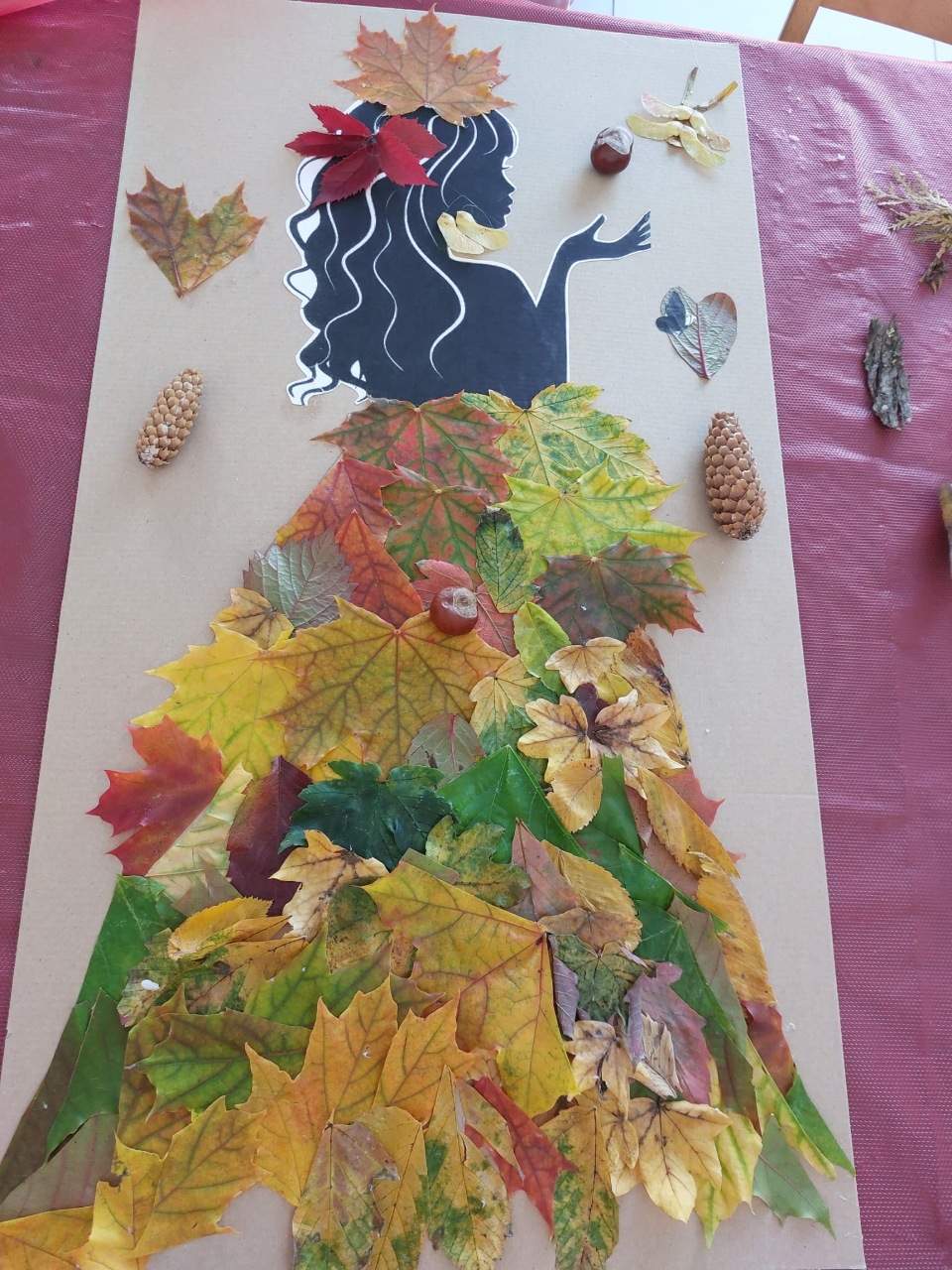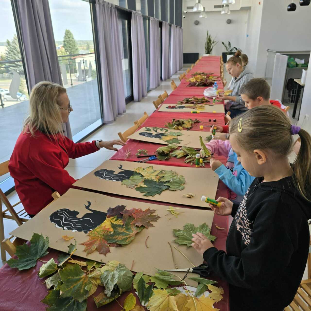 Dzieci tworzyły piękne portrety Pani Jesieni, ozdabiając jej suknie w barwy jesienne. Podczas warsztatów odbyła się krótka pogadanka o drzewach i liściach, które spotykamy na co dzień. Nie mogło oczywiście zabraknąć naszej Krówki Matyldy, która z zachwytem przyglądała się kolorowym pracom.