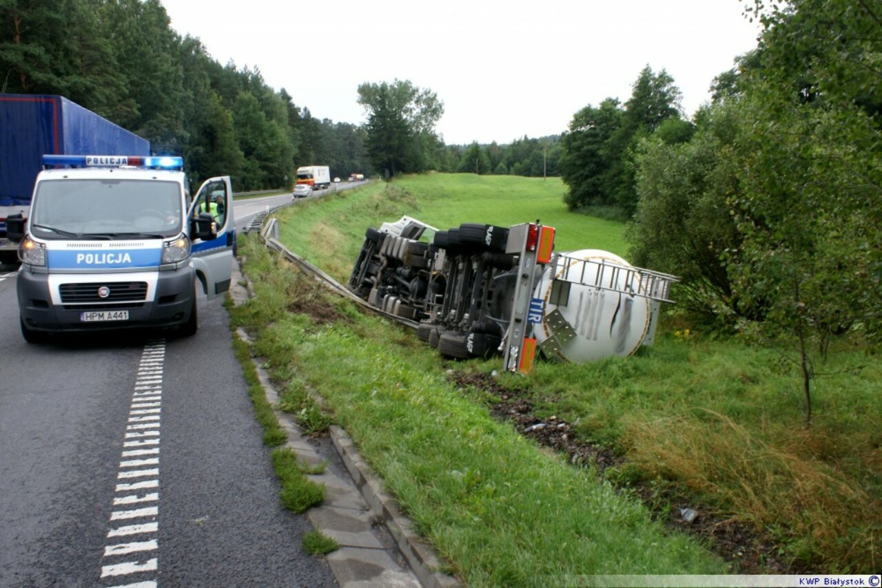 Dyżurny suwalskiej Policji powiadomiony został o zdarzeniu drogowym, do którego doszło wczoraj przed południem na ul. Szwajcaria w Suwałkach. Funkcjonariusze natychmiast pojechali na miejsce. Tam wstępnie ustalili, że kierowca samochodu ciężarowego jadąc drogą krajową nr 8 w kierunku Suwałk, zjechał na prawą stronę, zniszczył barierkę ochronną i wpadł do rowu. Tir przewrócił się na bok. Kierujący uciekł z miejsca zdarzenia. Po prawie 3 godzinach penetracji bagnistego terenu policjanci znaleźli 45-letniego białoruskiego kierowcę. Był przemoczony i ubrudzony. Badanie alkomatem wykazało, że był pijany. Miał ponad 2 promile alkoholu i noc spędził trzeźwiejąc w policyjnym areszcie. Suwalscy policjanci wyjaśniają okoliczności zdarzenia, a kierowca za swoje nieodpowiedzialne postępowanie odpowie teraz przed sądem.– oficer prasowy KMP w Suwałkach