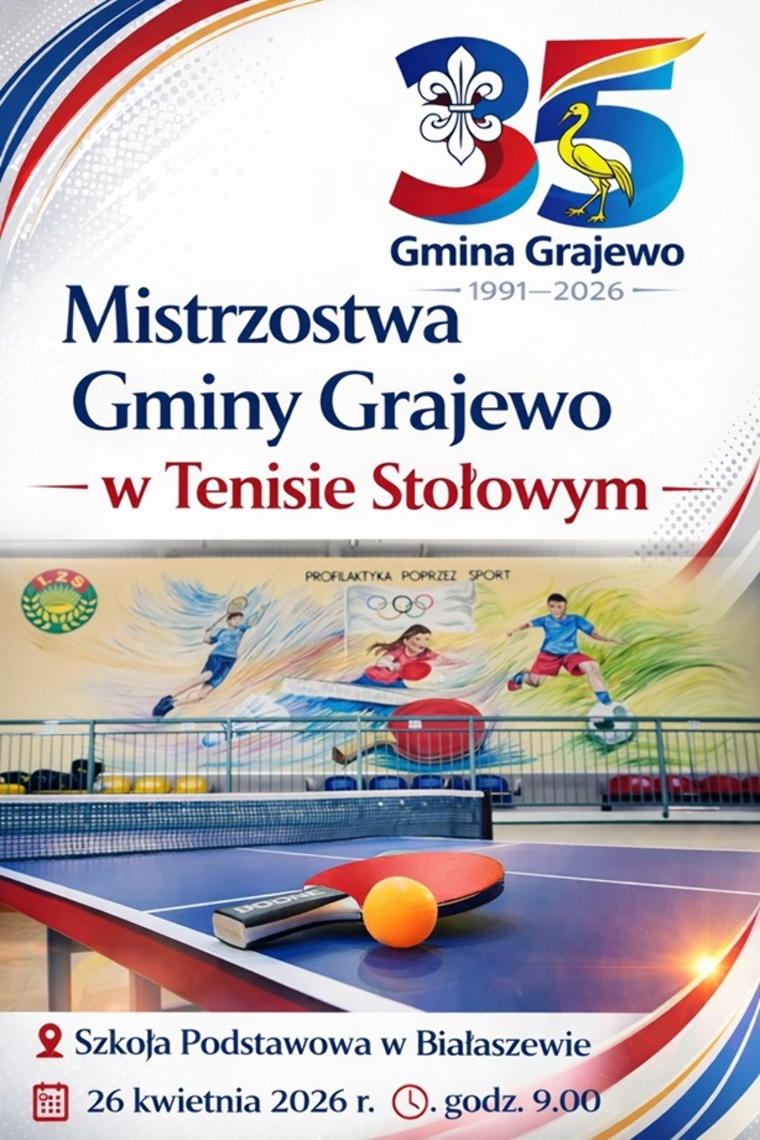 Mistrzostwa Gminy Grajewo w Tenisie Stołowym odbędą się w Szkole Podstawowej w Białaszewie w dniu 26 kwietnia 2026 r. (niedziela) o godz. 9.00.