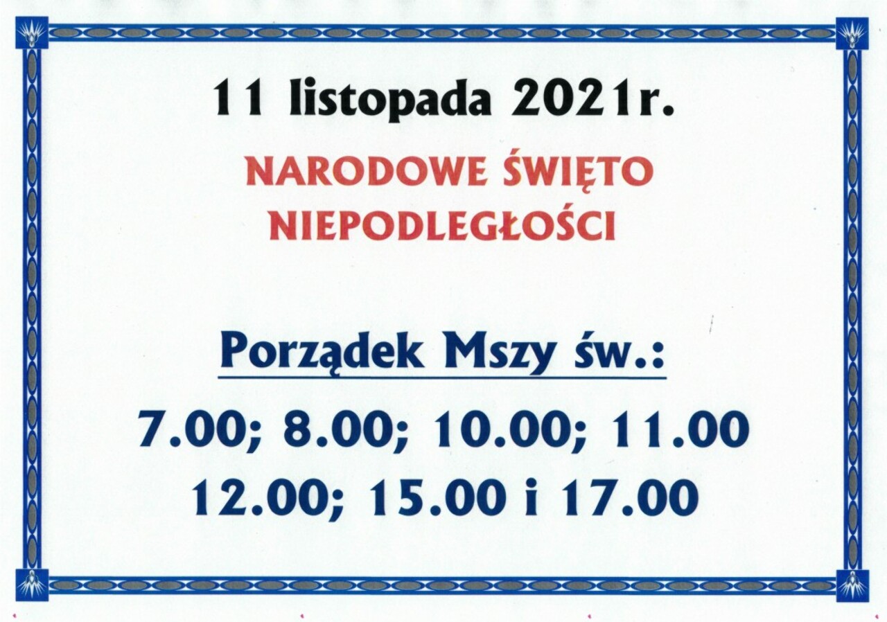 Porządek Mszy św. z modlitwą w intencji Ojczyzny i naszego Miasta w parafii Rzymskokatolicka pw. Św. Ojca Pio o godz. 7.00; 8.00; 10.00; 11.00; 12.00; 15.00 i 17.00
