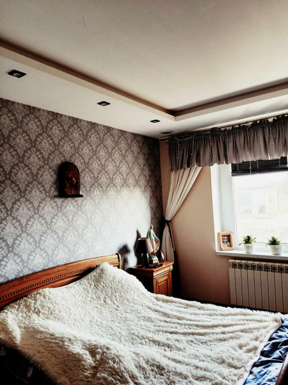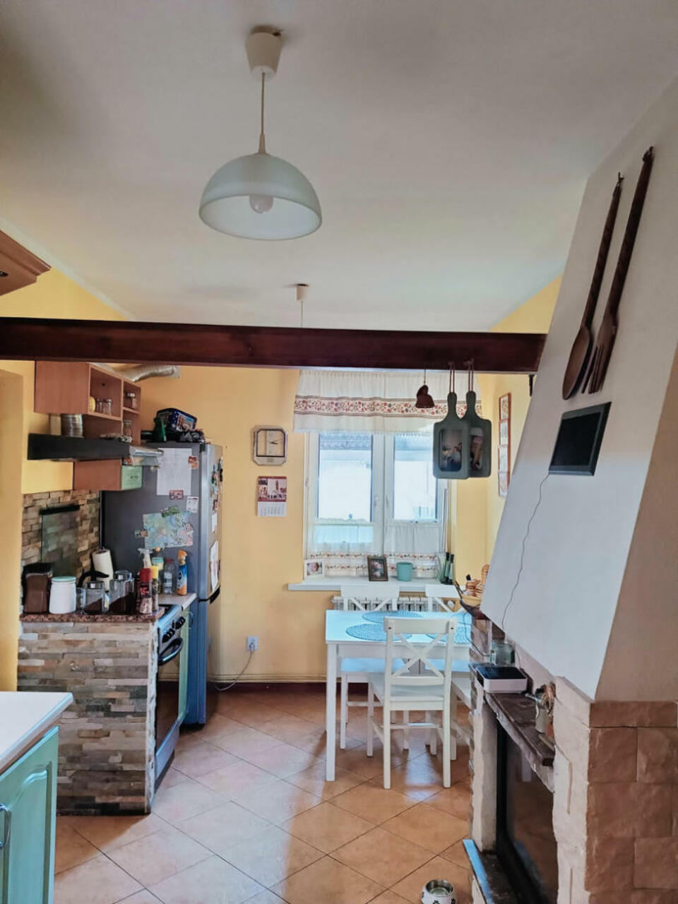 4 pokoje (jeden z nich to garderoba z szafami), kuchnia, łazienka, przedpokój. Ogrzewanie miejskie, plus możliwość samodzielnego ogrzewania, gdyż lokal wyposażony jest w kominek z płaszczem wodnym. Do nieruchomości przynależą taras oraz 2 duże ogródki, mieszczące namiot na warzywa i mały plac zabaw dla dzieci. Garaż na podwórku.