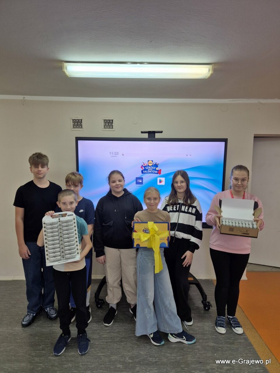Za jak najszybsze uzbieranie 3 000 talenciaków otrzymaliśmy zestaw Classwise Inteligentna Klasa czyli monitor interaktywny z 30 padami. Nagrodę zdobyliśmy dzięki zaangażowaniu i wyjątkowej determinacji społeczności szkolnej: dyrekcji, nauczycieli, rodziców i naszych uczniów ale również mieszkańców Grajewa oraz wszystkich przyjaciół szkoły, którzy, jak wiemy, zbierają dla nas talenciaki i pamiętają, że aktywnie uczestniczymy w akcji.