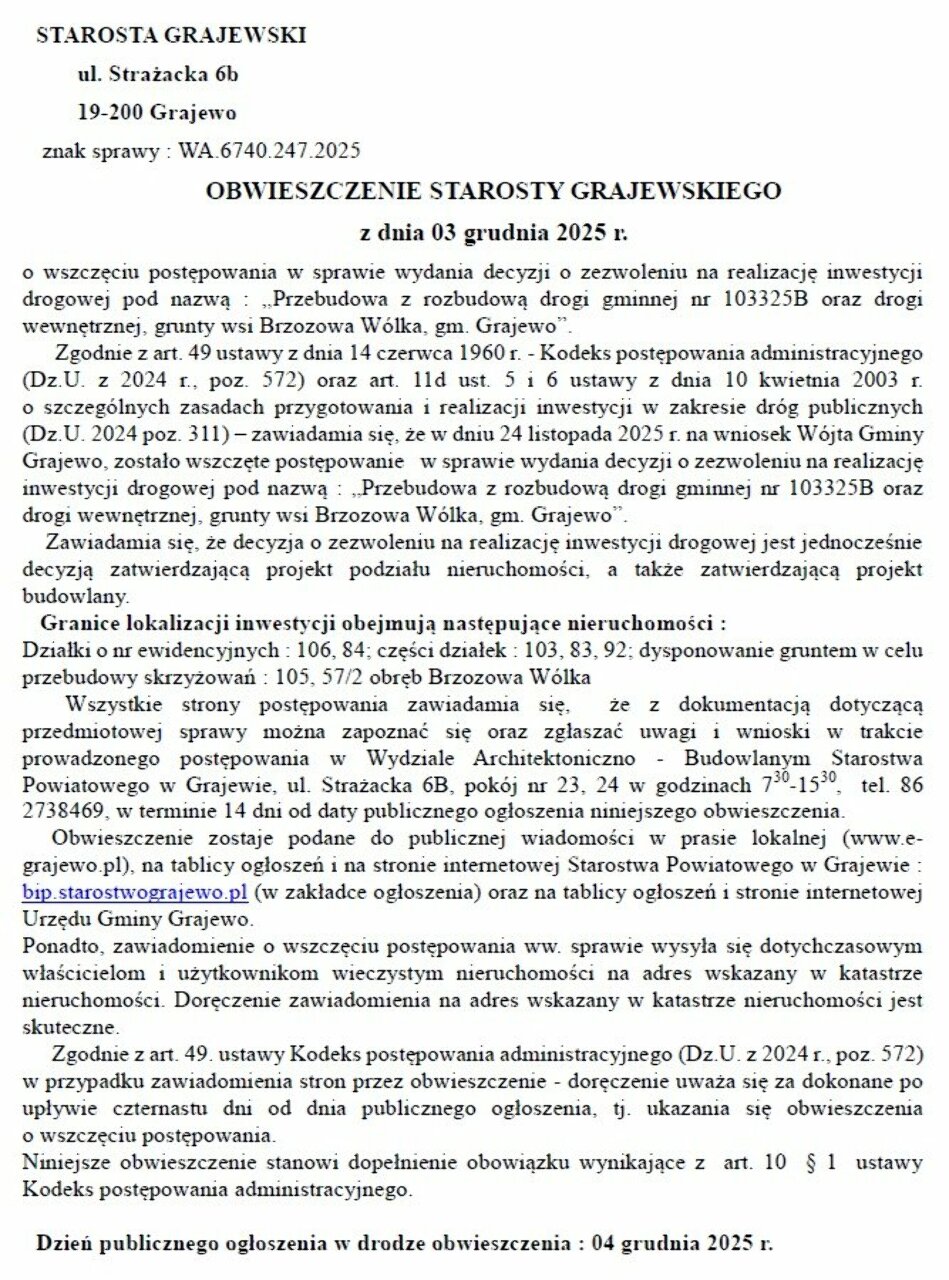 Obwieszczenie Starosty Grajewskiego z 3.12.2025
