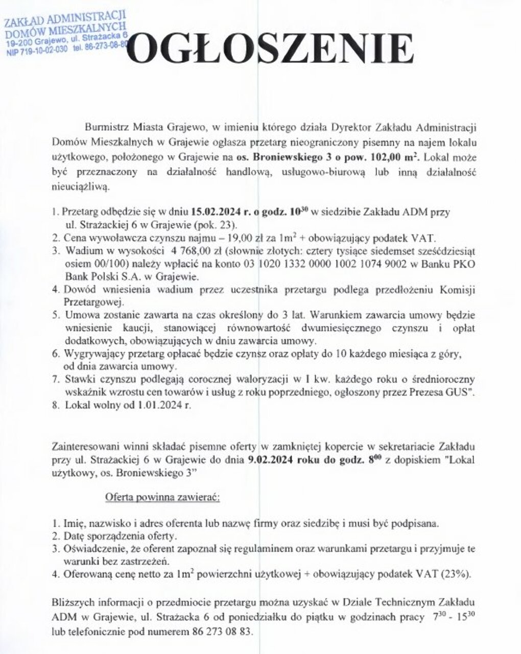 Przetarg nieograniczony pisemny na najem lokali użytkowych: