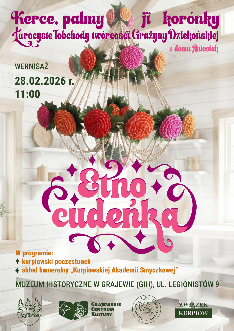 28 lutego 2026 r. (sobota) w Grajewskiej Izbie Historycznej odbędzie się wernisaż mistrzyni plastyki obrzędowej i zdobniczej Grażyny Dziekońskiej pt. „Etnocudeńka”.