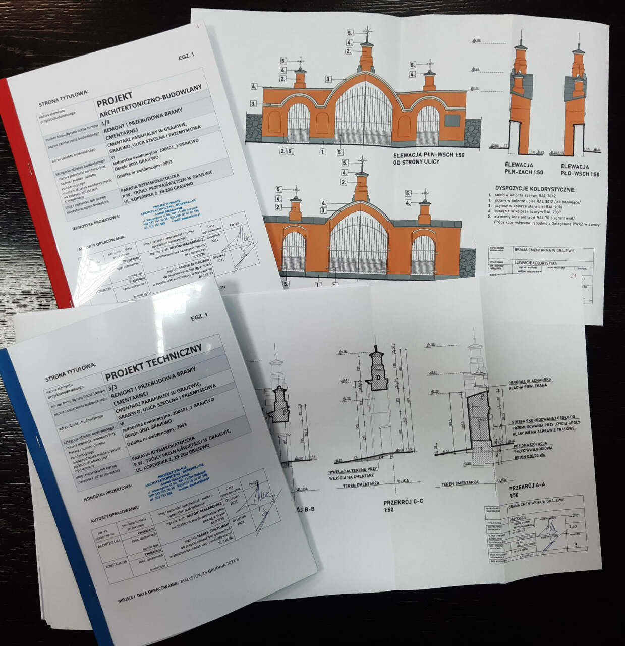 Dzięki współpracy Społecznego Komitetu Renowacji Grajewskiego Cmentarza Parafialnego w Grajewie, Parafii p.w. Trójcy Przenajświętszej oraz Miasto Grajewo odebrano projekt remontu i przebudowy bramy cmentarnej.