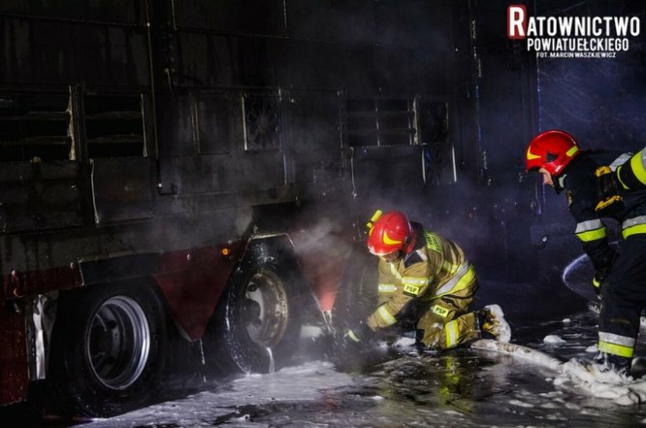 29 stycznia br. po godz. 20.00 doszło do pożaru ciężarówki przewożącej trzodę chlewną na trasie Ełk - Orzysz (DK16). W naczepie samochodu zapaliła się opona.