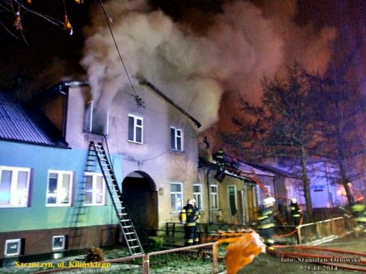 Po przybyciu na miejsce zdarzenia (ul. Kilińskiego) strażacy zastali gęste kłęby dymu wydobywające się z mieszkań budynku. W jednym z okien stała kobieta wołająca o pomoc, ogień odciął tam drogę ucieczki drewnianą klatką schodową. Strażacy ewakuowali z lokalu na poddaszu 4 osoby, 2 dorosłe i dzieci, na szczęście nie wymagali oni pomocy medycznej.