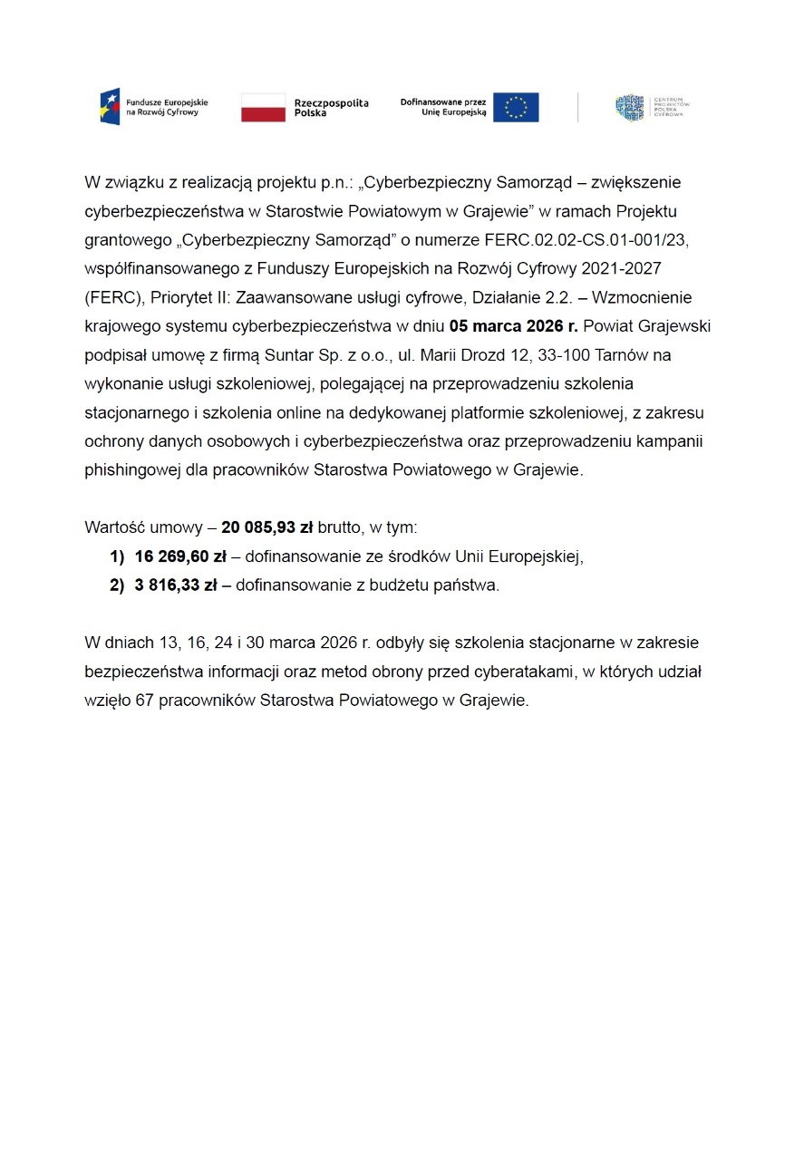 Dzisiaj, 30 marca 2026 r., zakończyły się szkolenia stacjonarne skierowane do pracowników Starostwa Powiatowego w Grajewie, realizowane w ramach projektu pn. „Cyberbezpieczny Samorząd – zwiększenie cyberbezpieczeństwa w Starostwie Powiatowym w Grajewie”.