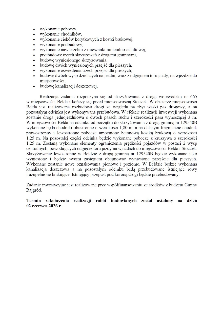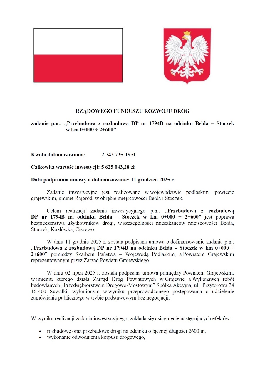 Na początku lipca 2025 r. informowaliśmy Państwa o podpisaniu umowy między Powiatem Grajewskim, a wykonawcą – Przedsiębiorstwem Drogowo-Mostowym S.A. w Suwałkach, na zadanie inwestycyjne pn. „Przebudowa z rozbudową DP nr 1794B na odcinku Bełda – Stoczek w km 0+000 ÷ 2+600”.