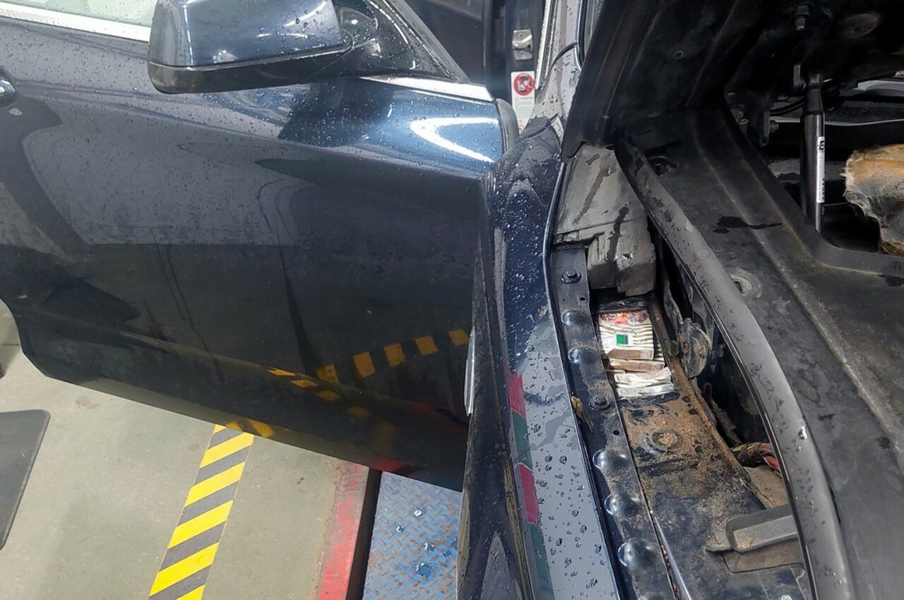 W wyniku przeszukania samochodu mundurowi znaleźli 1250 paczek papierosów z białoruskimi znakami akcyzy. Kontrabanda o wartości 22 tys. zł była ukryta m.in. w nadkolach, progach i nagrzewnicy niemieckiego auta.