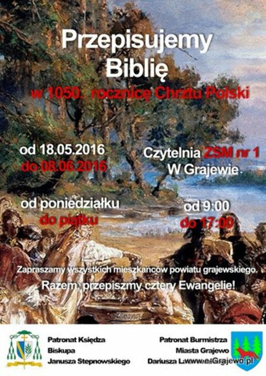 Zapraszamy serdecznie wszystkich mieszkańców Grajewa do wspólnego świętowania 1050. rocznicy Chrztu Polski poprzez wspólne przepisywanie Biblii.