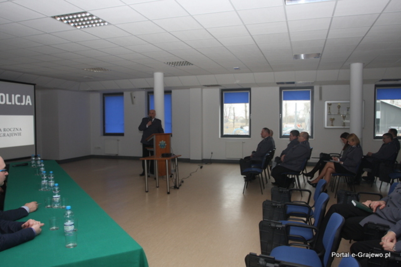 W miniony czwartek w Komendzie Powiatowej Policji w Grajewie odbyła się odprawa roczna, podczas której podsumowano efekty osiągnięte w służbie przez grajewskich policjantów. W odprawie udział wzięli Komendant Powiatowy Policji kom. Marek Sienkiewicz, p.o. I Zastępcy Komendanta Powiatowego - kom. Krzysztof Kuligowski, kadra kierownicza jednostki, policjanci, pracownicy komendy oraz zaproszeni gości, a wśród nich: przedstawiciele lokalnych władz samorządowych, prokuratury, straży pożarnej oraz kapelan Policji. Podczas spotkania kom. Krzysztof Kuligowski, przedstawił efekty pracy poszczególnych pionów służbowych oraz priorytety na 2016 rok. Z analizy przedstawionych danych wynikało, iż 2015 r. to kolejny rok z rzędu, kiedy przestępczość w powiecie grajewskim spada.
