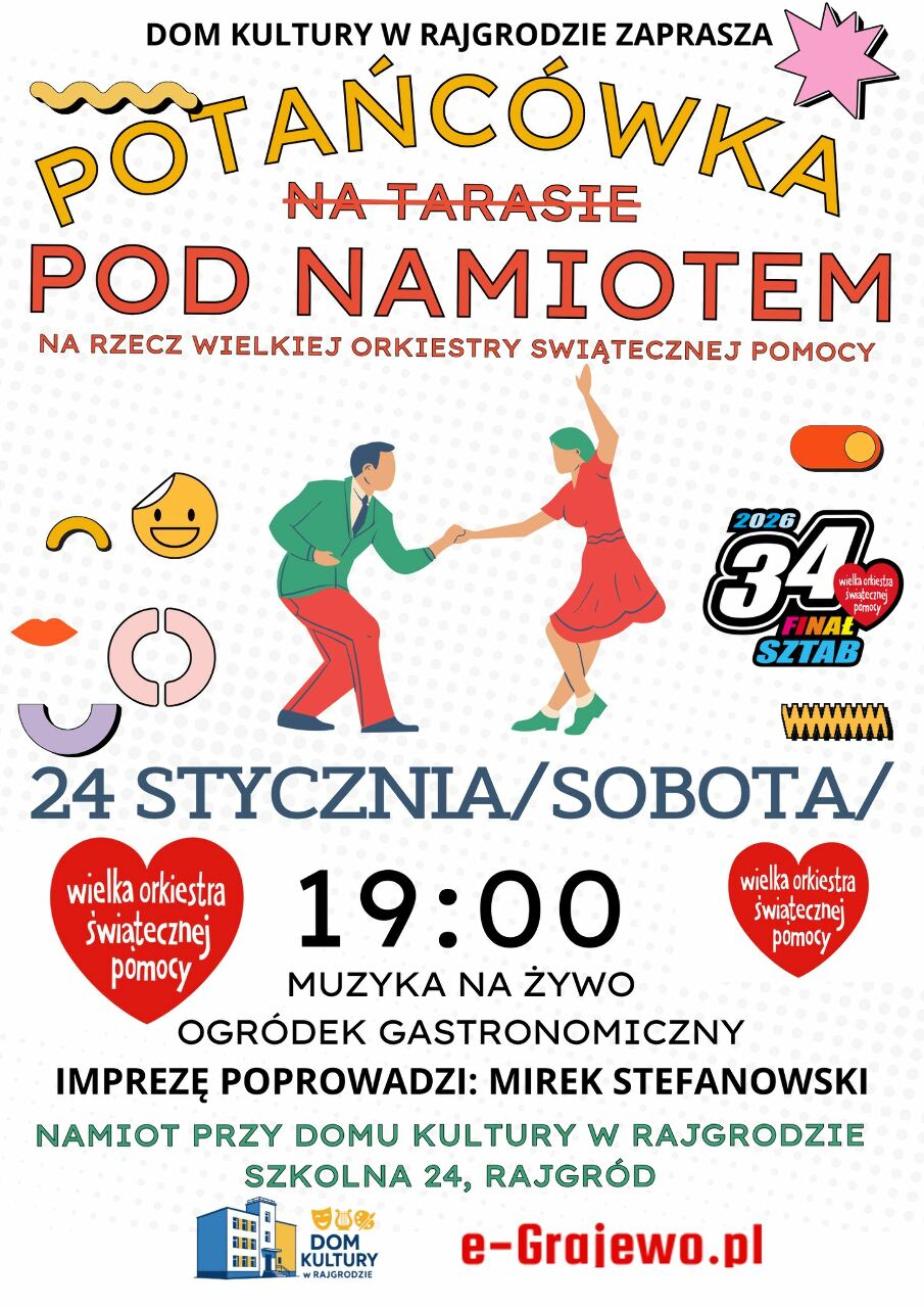 W sobotę, 24 stycznia, zapraszamy pod namiot przy Domu Kultury w Rajgrodzie. Tym razem nie na tarasie – gramy i tańczymy pod namiotem, bez względu na pogodę.