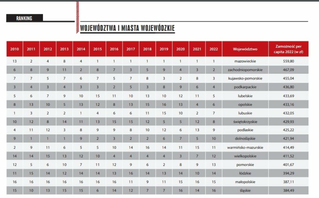 Ale czołówki poszczególnych tabel są stabilne. Wśród województw – mazowieckie, wśród miast wojewódzkich – Warszawa i Opole, wśród miast na prawach powiatu – Sopot i Płock – utrzymują pozycje na szczytach rankingu od lat. Podobnie z Polkowicami, Zakopanem i Grodziskiem Mazowieckim wśród miast powiatowych czy wspomnianym Kleszczowem i Mielnem wśród gmin wiejskich.