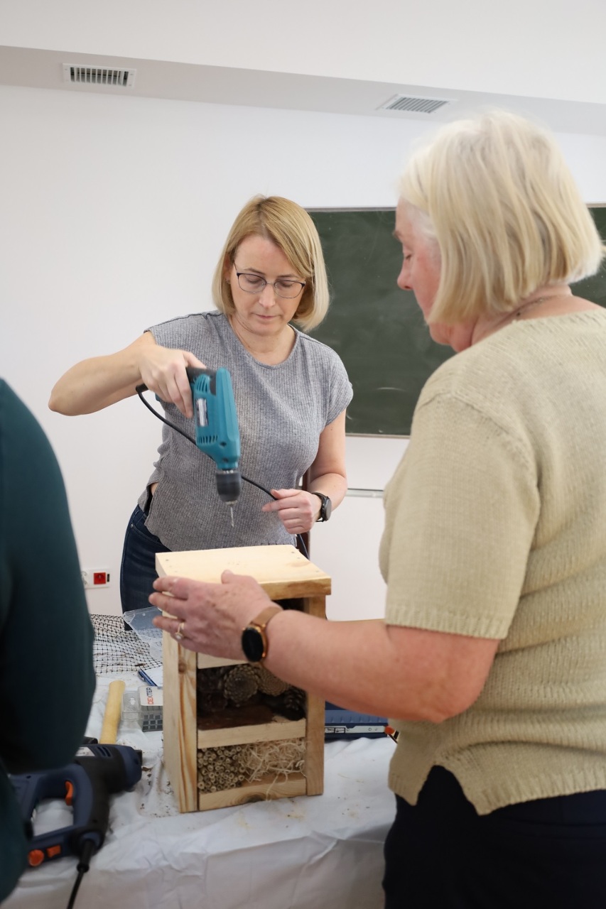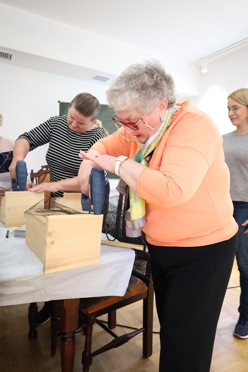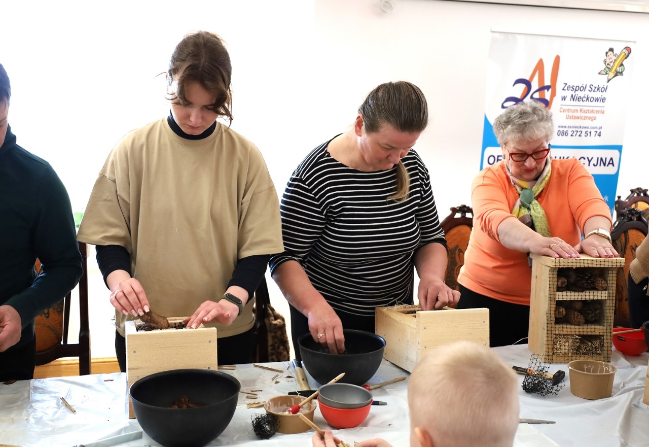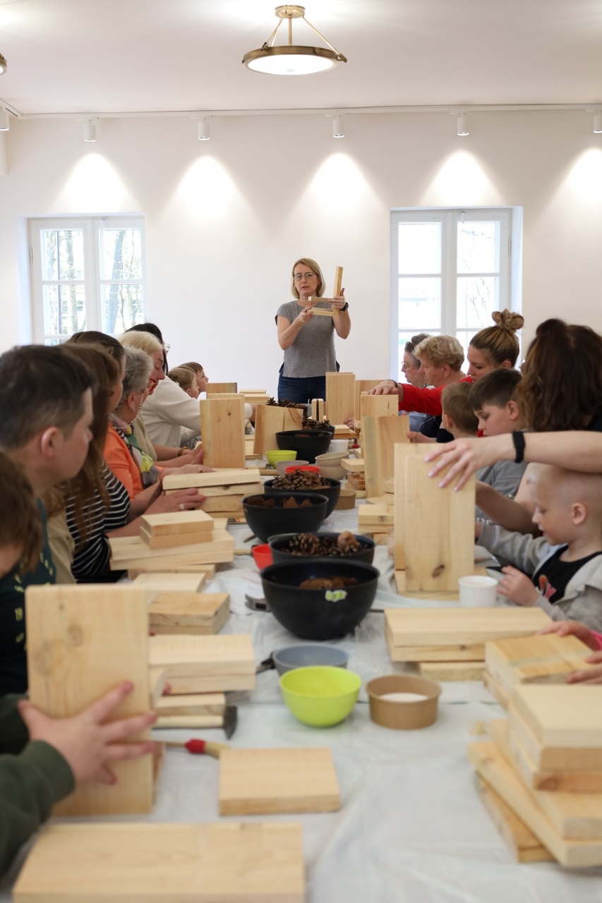 Można by pomyśleć, że zajęcia przebiegały w ciszy i skupieniu, jednak nic bardziej mylnego. Na początku było naprawdę głośno – trzeba było zbić bryłę domku przy pomocy młotka i gwoździ. Choć to pozornie prosta czynność, dla najmłodszych była ogromną atrakcją, zwłaszcza że niektórzy po raz pierwszy próbowali swoich sił w wbijaniu gwoździ. Podczas wypełniania domków szyszkami, korą czy pociętą trzciną zrobiło się nieco spokojniej, choć wciąż towarzyszyło temu wiele emocji i dobrej zabawy. Gotowe konstrukcje zabezpieczono z przodu i z tyłu siatką, aby wypełnienie nie wypadało, a na koniec każdy uczestnik wkręcił haczyk w daszek, dzięki czemu domek można również zawiesić.
