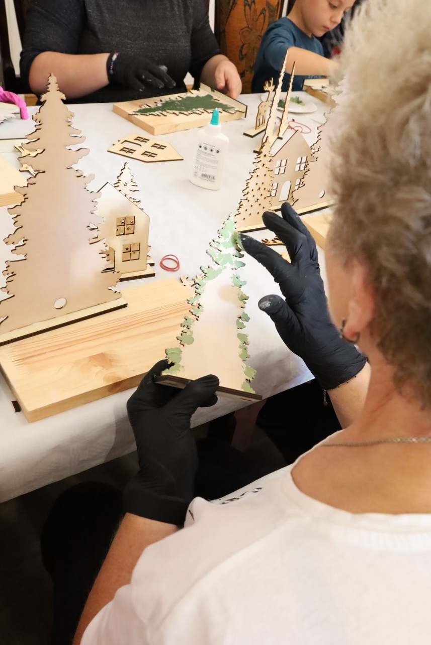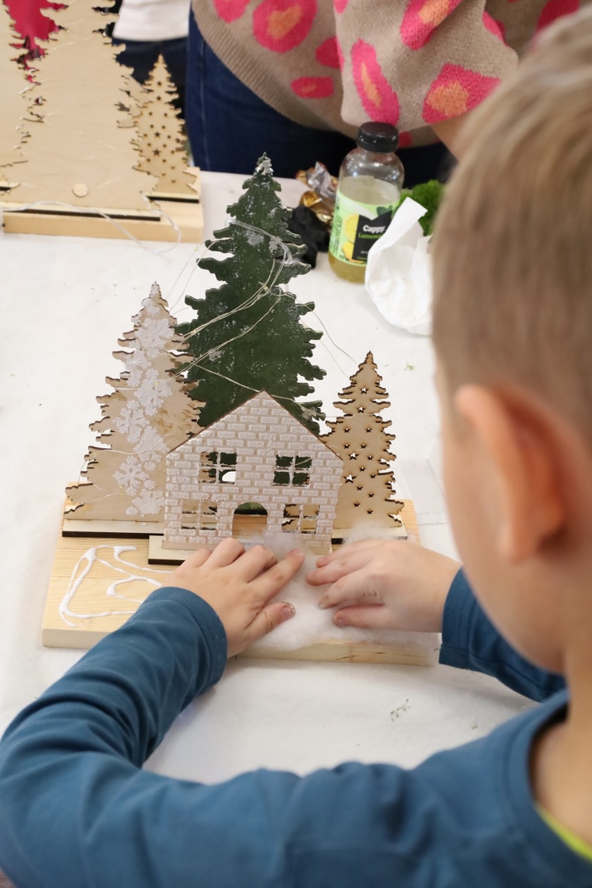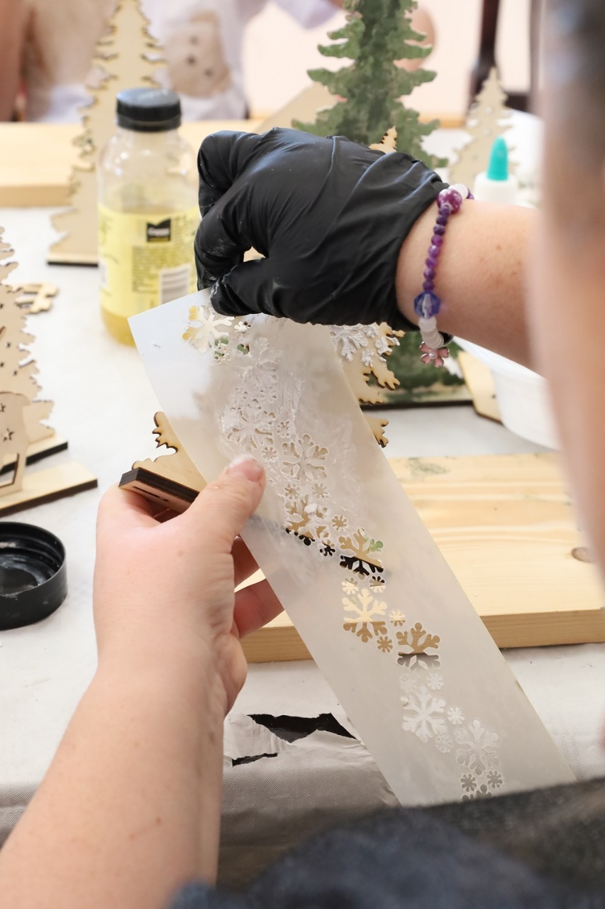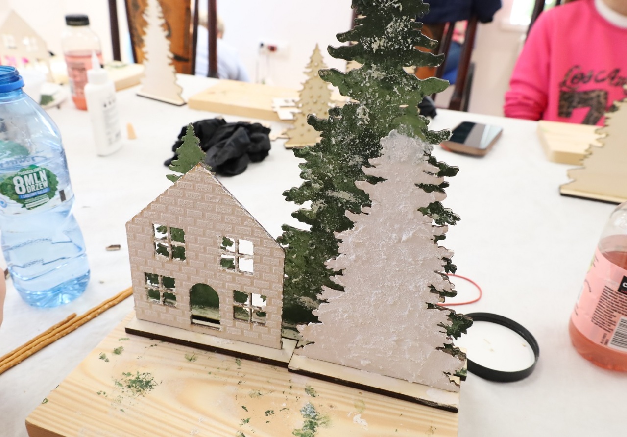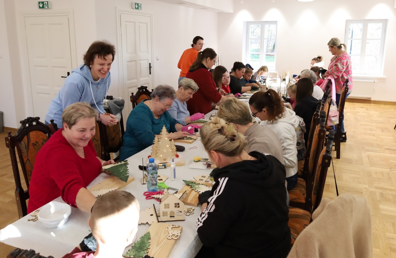 Uczestnicy mieli przed sobą sporo twórczych zadań: od gruntowania elementów, które chcą ozdobić, nakładania masy strukturalnej, malowania na różne odcienie zieleni , aż po uważne suszenie każdej warstw. Kulminacyjnym etapem było oczywiście składanie i dekorowanie stroików – proces, który wzbudził najwięcej radości, zwłaszcza wśród najmłodszych. To właśnie wtedy dzieci mogły puścić wodze fantazji, sięgając po miękki mech, włókninę imitującą śnieg, błyszczące bombki, kolorowe koraliki - całą paletę drobnych ozdób. Całość dopełniały nastrojowe lampeczki LED, które sprawiły, że stroiki dosłownie rozbłysły świątecznym urokiem.