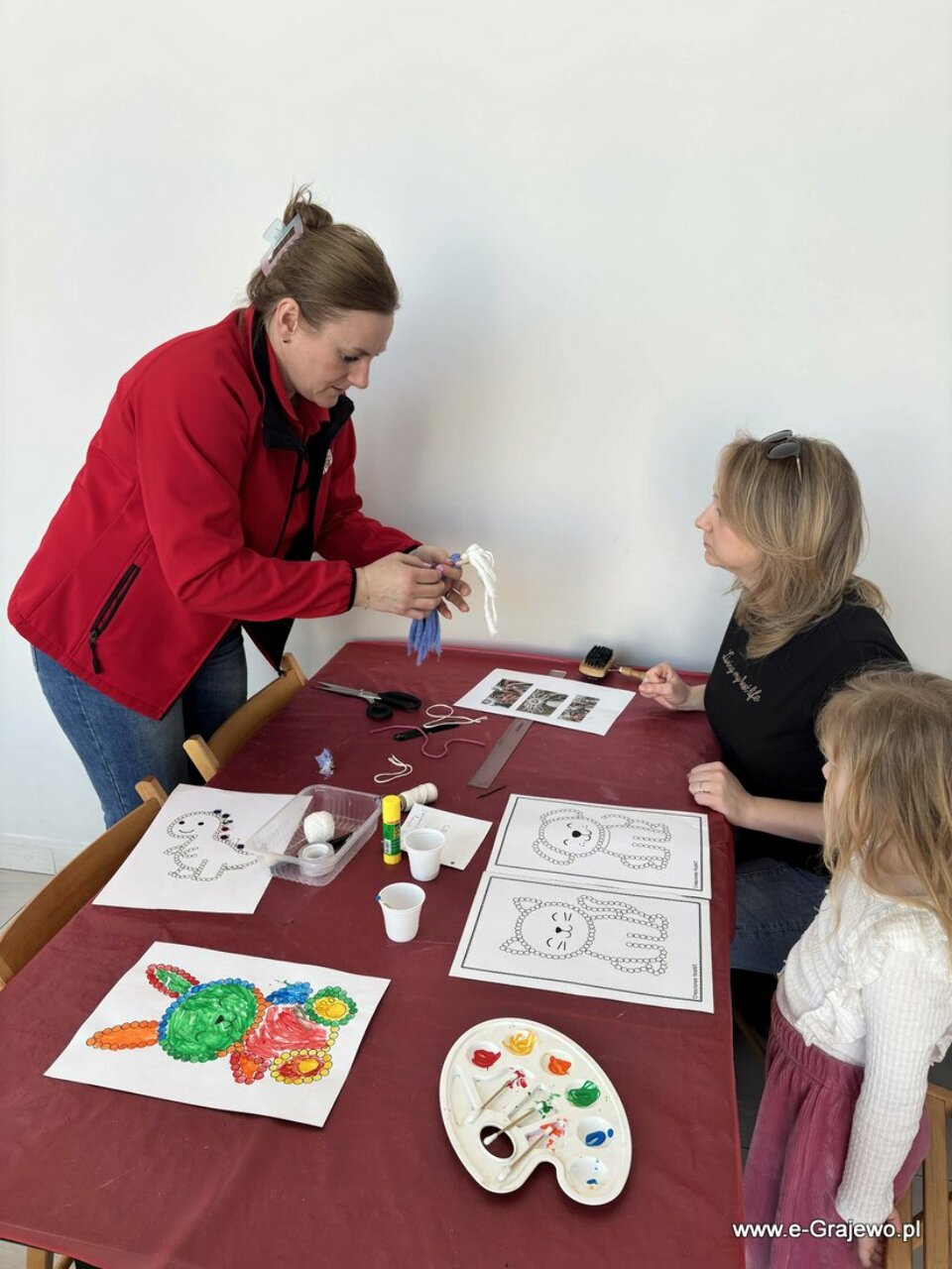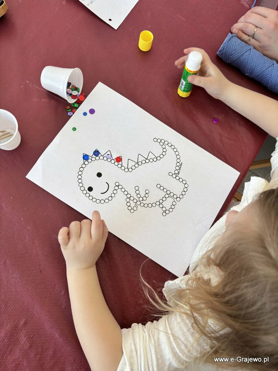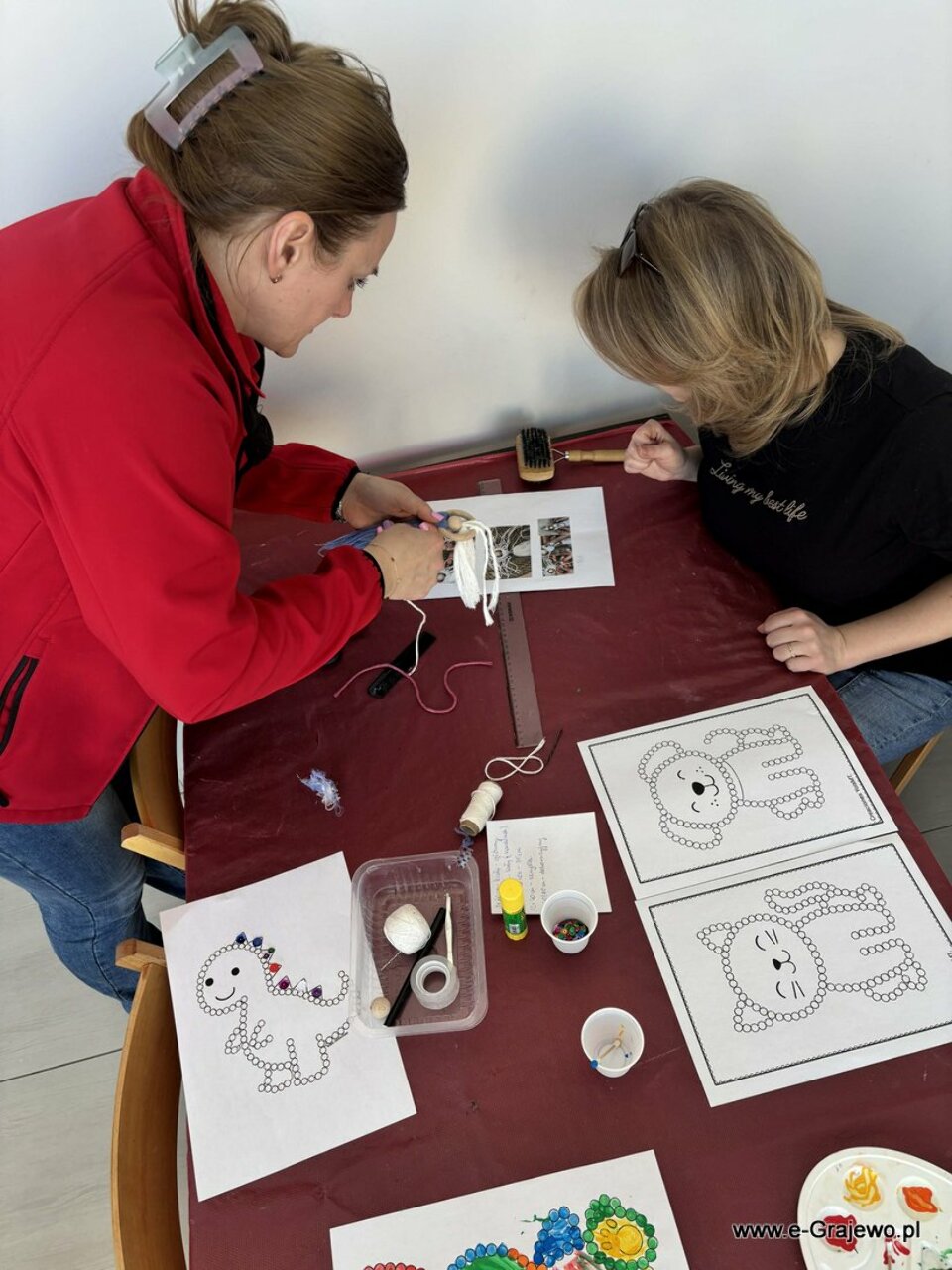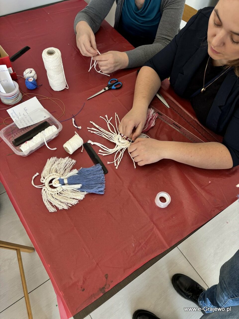 Na dzisiejszym spotkaniu rodzice tworzyli aniołki z makramy. Wszyscy poradzili sobie znakomicie, aniołki wyszły piękne, każdy z nich był inny i wyjątkowy. W tym czasie dzieci zajęły się kropkowaniem obrazków farbami i zdobieniem ich cekinami. Po zakończeniu malowania najmłodsi zajęli się zabawą klockami, co umiliło im czas!