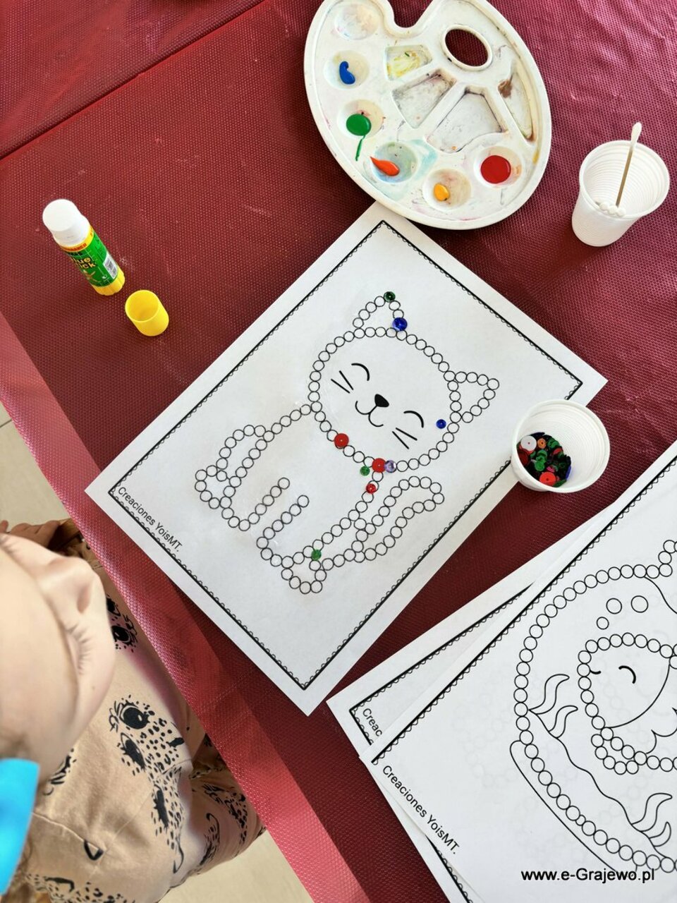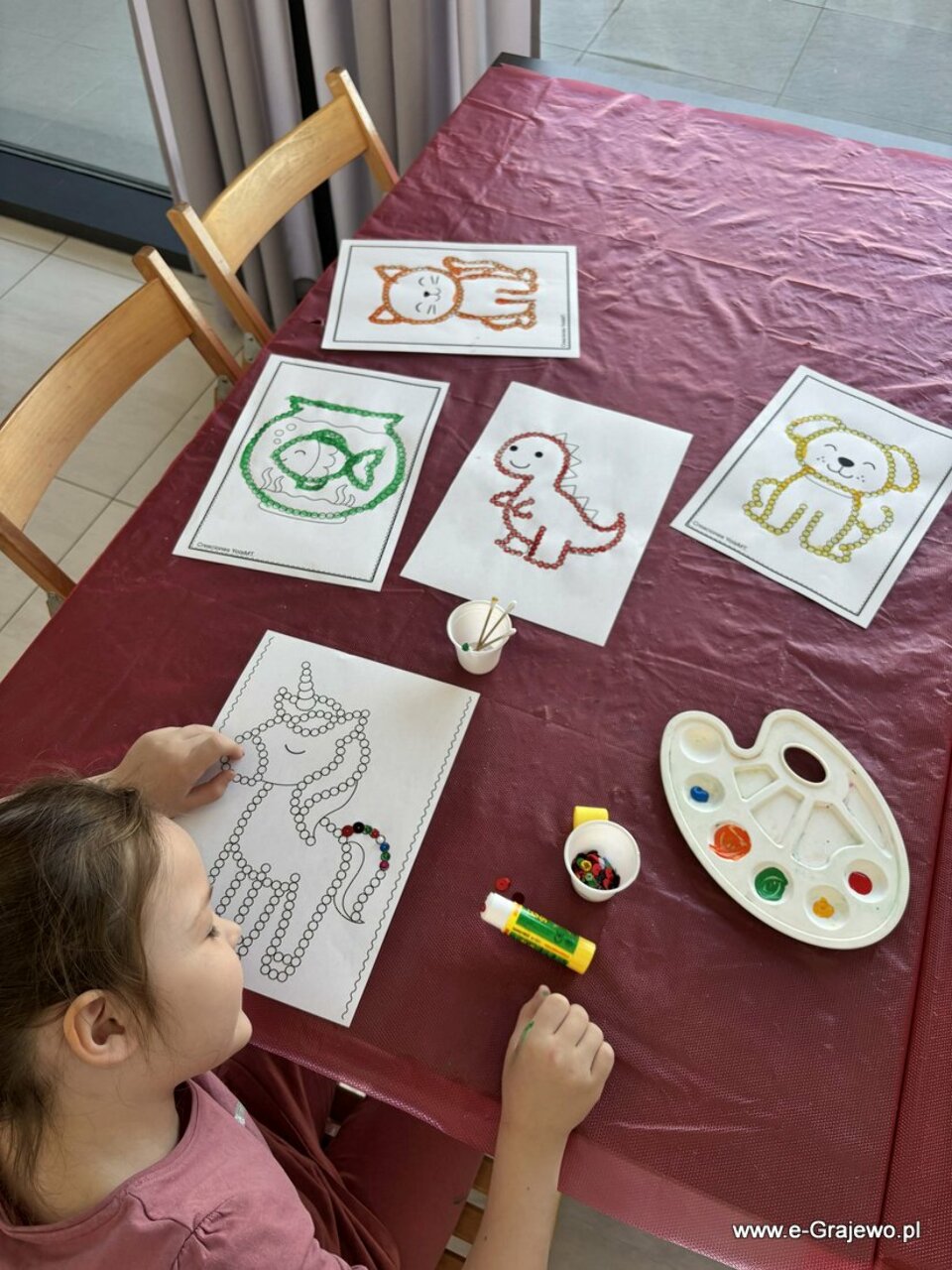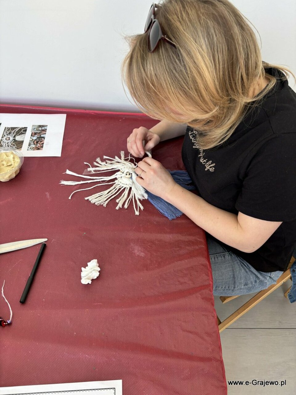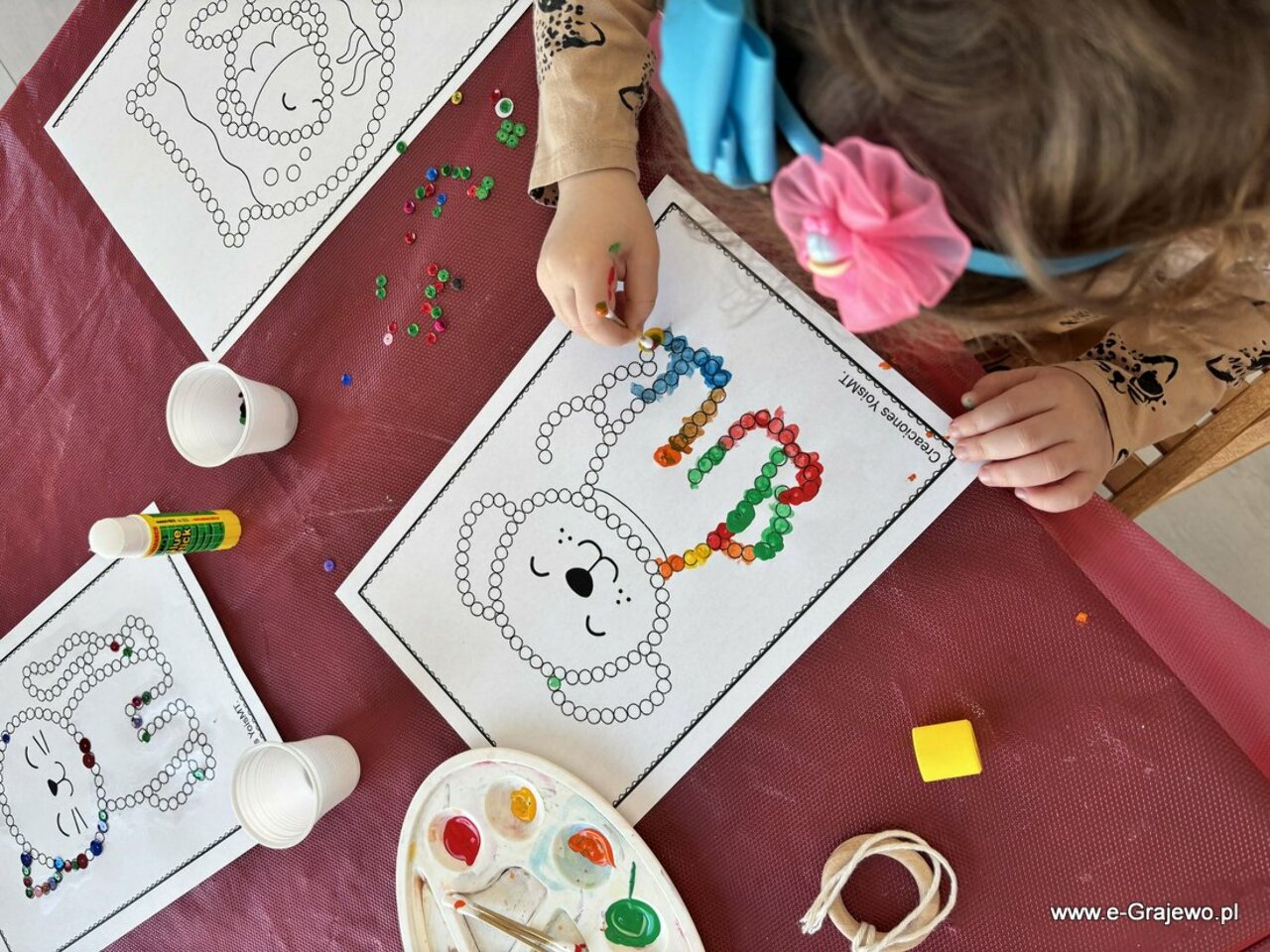 Na dzisiejszym spotkaniu rodzice tworzyli aniołki z makramy. Wszyscy poradzili sobie znakomicie, aniołki wyszły piękne, każdy z nich był inny i wyjątkowy. W tym czasie dzieci zajęły się kropkowaniem obrazków farbami i zdobieniem ich cekinami. Po zakończeniu malowania najmłodsi zajęli się zabawą klockami, co umiliło im czas!